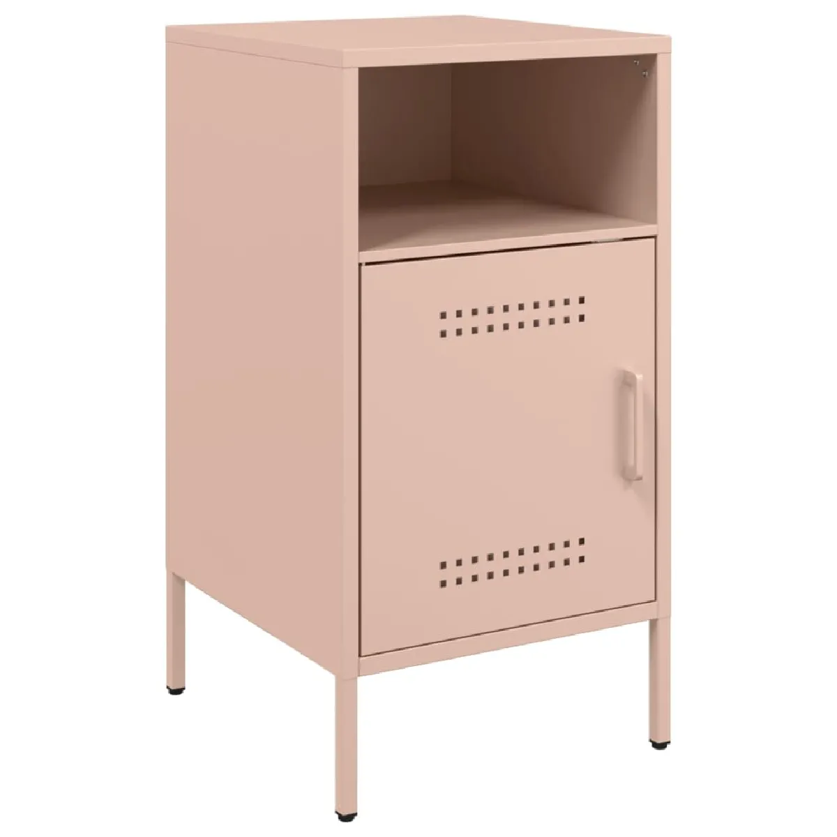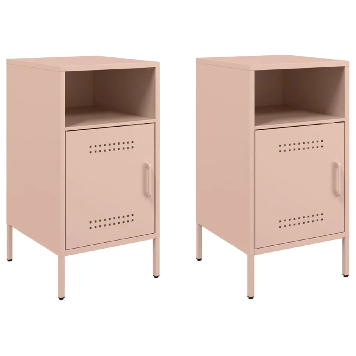 Le duo optimise l'organisation quotidienne grâce à deux compartiments fonctionnels et une porte qui dissimule les petits objets. La structure en acier laminé à froid assure une surface lisse et une solidité régulière, adaptée aux usages du soir comme au rangement d'appoint. Avec leurs pieds à vis réglables pour compenser les irrégularités du sol, ces chevets restent stables près du lit ou d'un canapé. Leur format de 36 x 39 x 68 cm facilite l'accès aux livres, lunettes et télécommandes, tout en libérant l'espace visuel. Le coloris rose apporte une note douce à un style industriel discret et facile à intégrer.