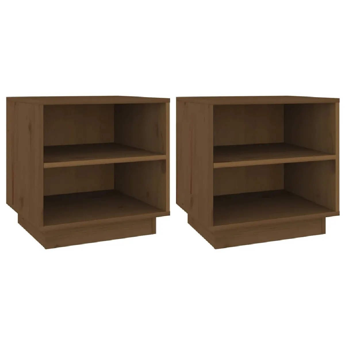 Un agencement simple optimise l'espace près du lit grâce à deux étagères ouvertes faciles d'accès qui gardent livres, lunettes ou télécommande à portée de main. Réalisées en bois de pin massif couleur marron miel, ces tables de chevet associent stabilité et rendu naturel adapté à une chambre de style moderne. Leur gabarit de 40 x 34 x 40 cm s'intègre aisément de chaque côté du lit ou dans un coin lecture. La surface supérieure accueille lampe et réveil, tandis que les niches de 37 x 15 cm facilitent le tri des essentiels du quotidien. Un montage est requis avant la mise en place.