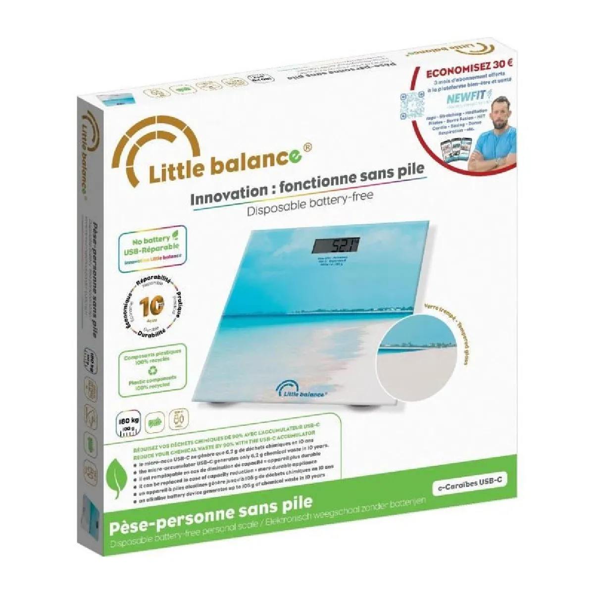 La plateforme en verre trempé 28 x 28 cm offre une assise plane et résistante pour des pesées régulières. La capacité de 180 kg avec une précision de 100 g convient à différents profils d'utilisateurs, avec un résultat stable et facile à lire sur l'écran LCD. La base 100% en plastique recyclé contribue à réduire les matériaux vierges, tout en conservant une construction adaptée à un usage domestique récurrent.