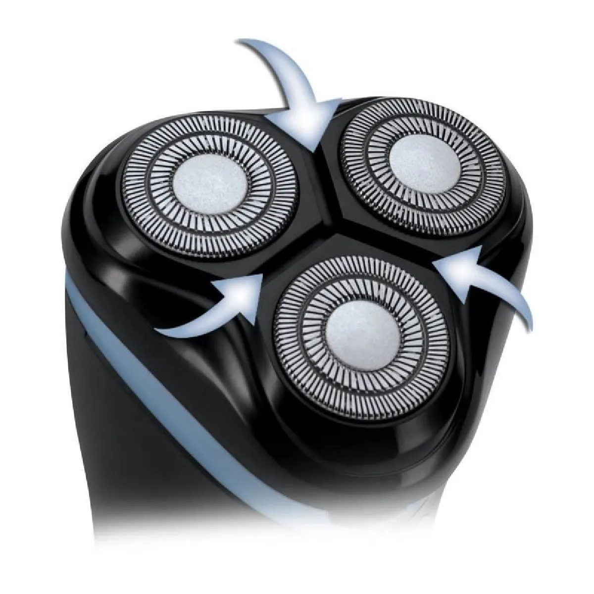 Le système à trois têtes rotatives exploite des lames Dual Track pour capturer davantage de poils à chaque passage, limitant le nombre d'allers-retours. Cette architecture facilite le rasage rapide des zones comme le menton et la mâchoire, tout en conservant une coupe régulière. La tondeuse de précision escamotable intégrée permet d'aligner les contours de la barbe, d'affiner la moustache et de définir les bords des pattes sans changer d'outil.