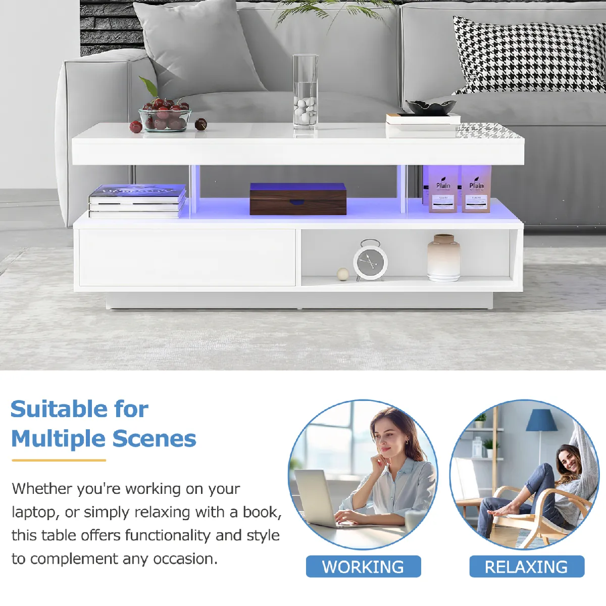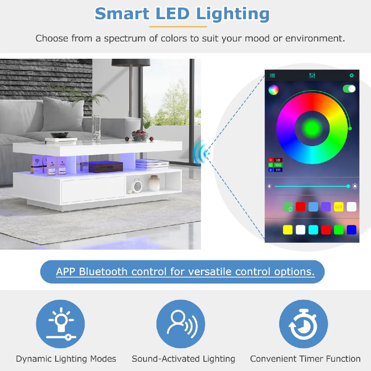 L'éclairage LED intégré ajoute une ambiance personnalisable via application Bluetooth, avec réglage de la couleur, de la luminosité et de la température selon l'usage. La fonction mémoire restaure les préférences à l'allumage, pour retrouver instantanément l'atmosphère souhaitée. Les dimensions maîtrisées favorisent la circulation autour du canapé, tandis que la charge maximale de 35 kg couvre les besoins courants. Le montage est indiqué comme simple avec un guide, afin de mettre rapidement la table en service au quotidien.