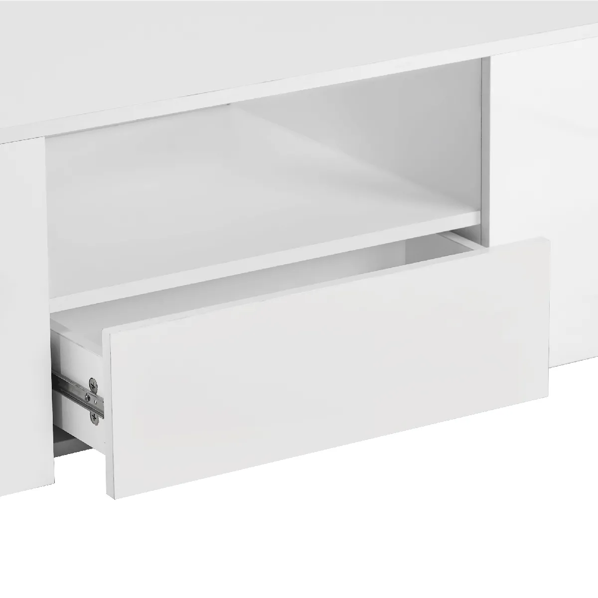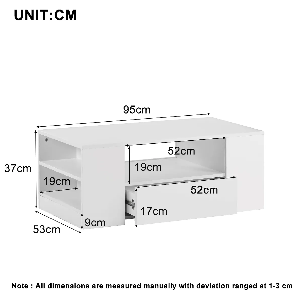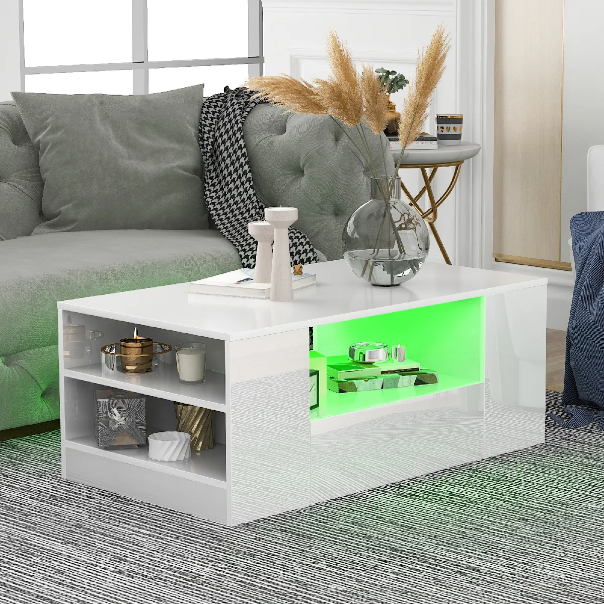 OKWISH Table basse blanche brillante LED, 2 tiroirs, 2 étagères |