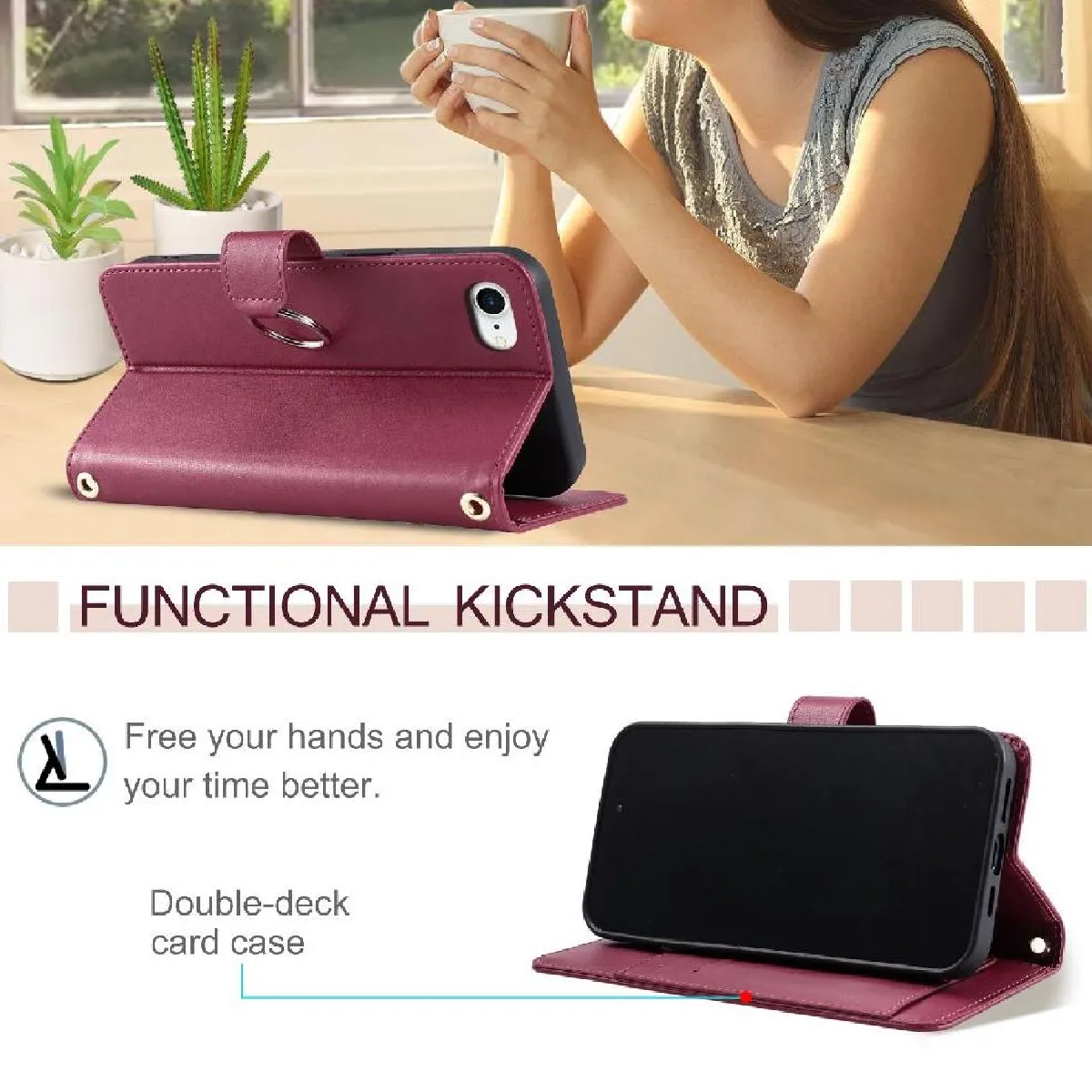 Équipé d'emplacements pour cartes pour cartes de crédit, pièces d'identité et espèces, ainsi que d'un porte-carte convertible qui sert également de béquille pour la visualisation.
