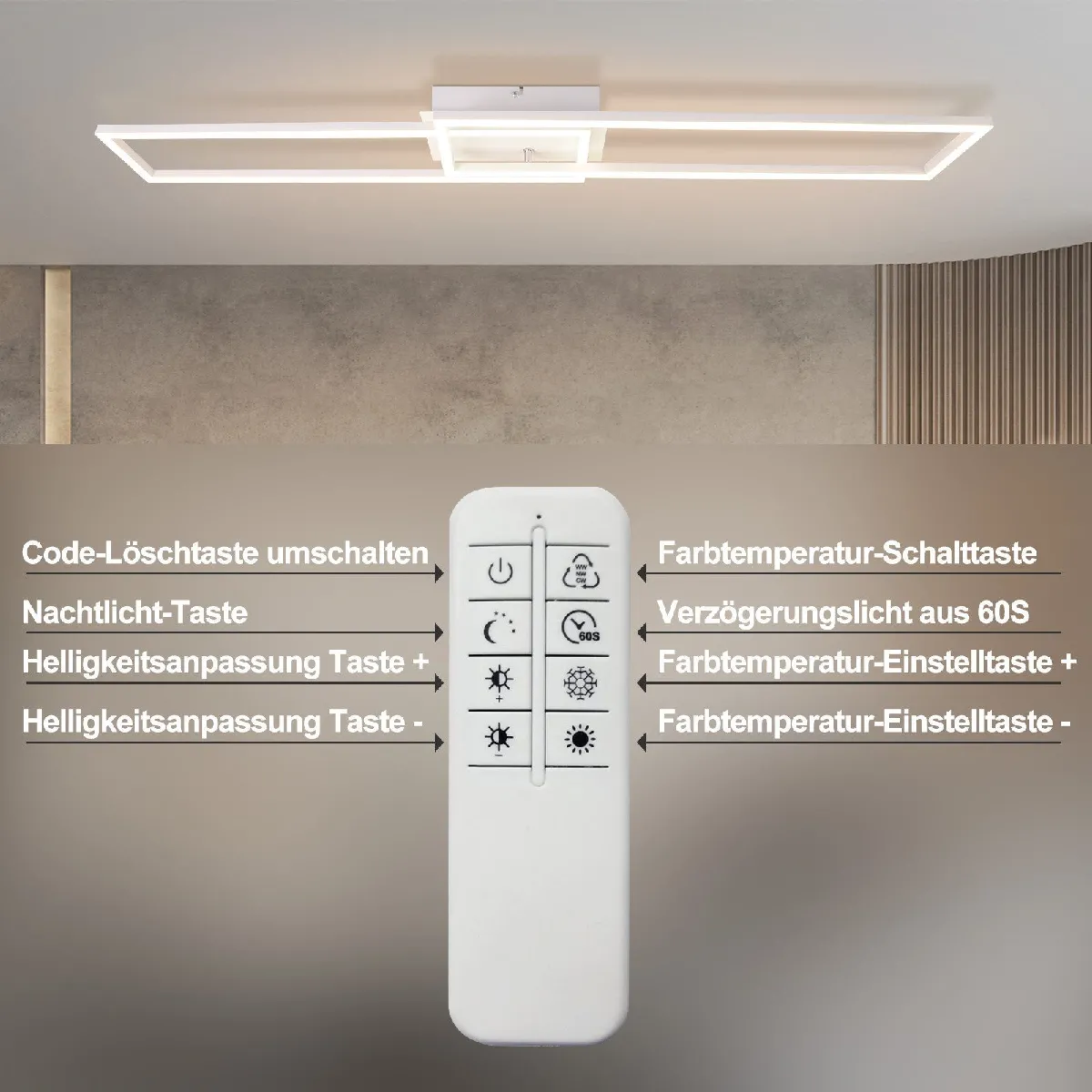 Contrôle de la lumière par télécommande : le plafonnier du salon offre une luminosité réglable (10 %-100 %) et une température de couleur (3000-6500K). Une simple pression sur le bouton de la télécommande crée une atmosphère atmosphérique ! Le plafonnier LED testé médicalement garantit une lumière 100 % sans scintillement et à faible éblouissement, douce pour les yeux des enfants et des personnes âgées.