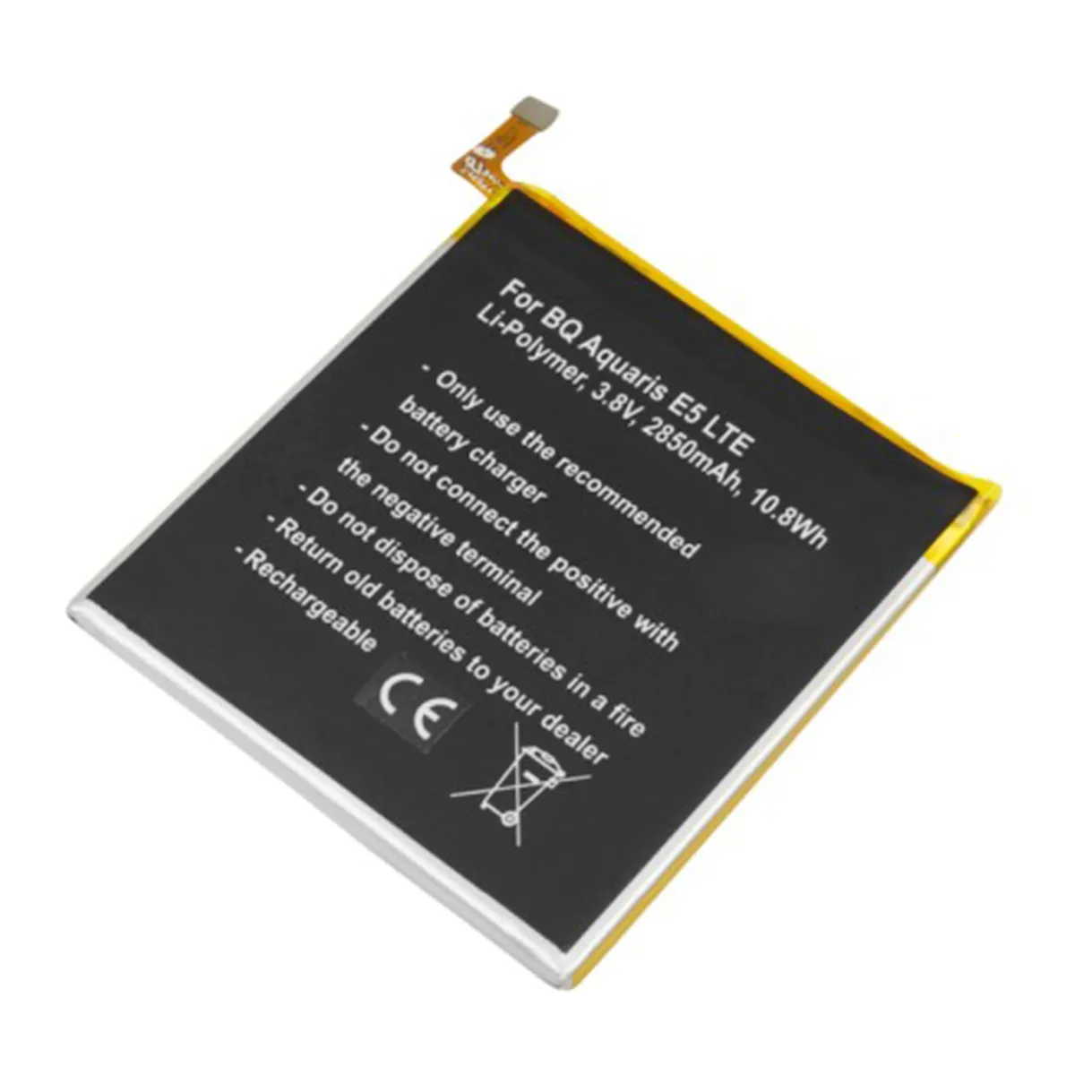Batterie Li-Polymer 3,8V 2850mAh, énergie 10,8 Wh. Compatible avec les smartphones BQ Aquaris E5 4G, E5 LTE, E5.0 et les références internes 0759, 0760, 0858. Remplace la batterie BQ B25. Connecteur nappe intégré. Produit rechargeable conçu pour une installation interne.
