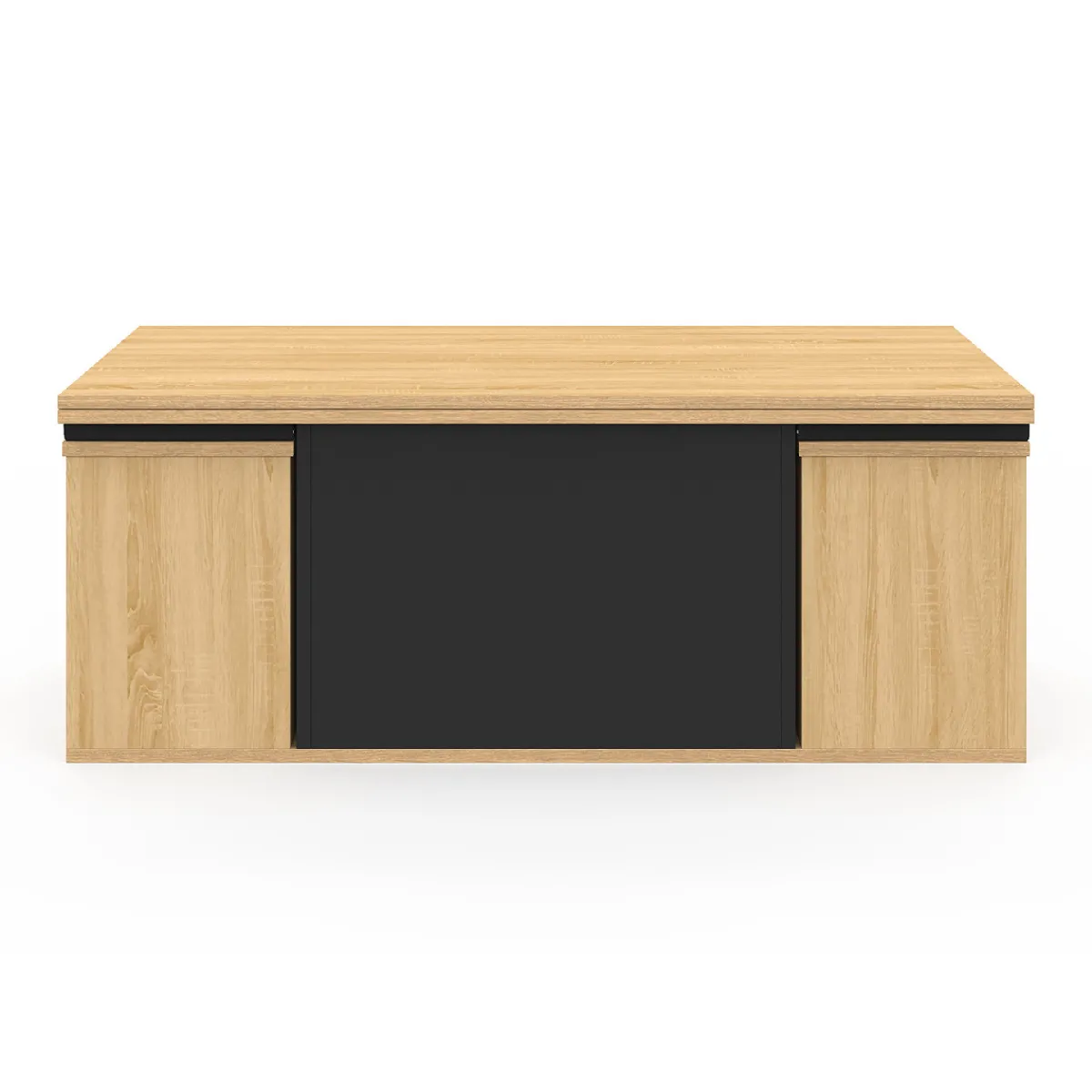 Fonctionnelle et gain de place, elle se transforme en table à manger de salon lorsque vous désirez prendre un apéritif ou manger dans votre séjour.Son double plateau relevable, adaptable à toutes les situations, vous permettra d'organiser un apéritif entre amis, de prendre un repas ou une collation devant la télévision ou encore de vous aménager un coin bureau improvisé tout en gardant une position confortable dans votre canapé pour télétravailler.Astucieuse, elle est accompagnée de 4 poufs, conçus pour allier confort, praticité et gain de place. Ils se rangent sous la table une fois utilisés, et chacun dissimule un coffre de rangement pratique pour vos accessoires du quotidien : plaids, magazines, jeux de société...Grâce à ces assises incluses, plus besoin de chaises supplémentaires : vous êtes toujours prêt à partager un repas ou un moment entre amis, sans compromis sur l'espace.Cette table multifonction offre également une solution de rangement fermé grâce à son compartiment central situé sous les deux plateaux relevables. Rangez vos revues et télécommandes et gardez un espace libre pour poser vos plateaux télé ou votre ordinateur !La structure de cette jolie table basse, en panneaux de particules de bois, lui confère stabilité et robustesse. Entre mobilier gain de place et esprit de partage, cette table basse convertible trouvera vite sa place dans votre intérieur !Dimensions de la table basse relevable en table à manger EDEN avec poufsDimensions globales : Longueur 100 cm x largeur 55/110 cm x Hauteur 39/51 cmDimensions relevée et dépliée: L. 100 x l. 110 x H. 51 cmDimensions des poufs : L. 24 x l. 24 x H. 33 cmÉpaisseur des coussins : 2,5 cmDimensions du petit plateau : L. 29,5 x l. 30,5 cmMatériaux : panneaux de particules de bois mélaminéColoris : bois et noirDécouvrez l'ensemble de notre collection moderne sur notre boutique en ligne !