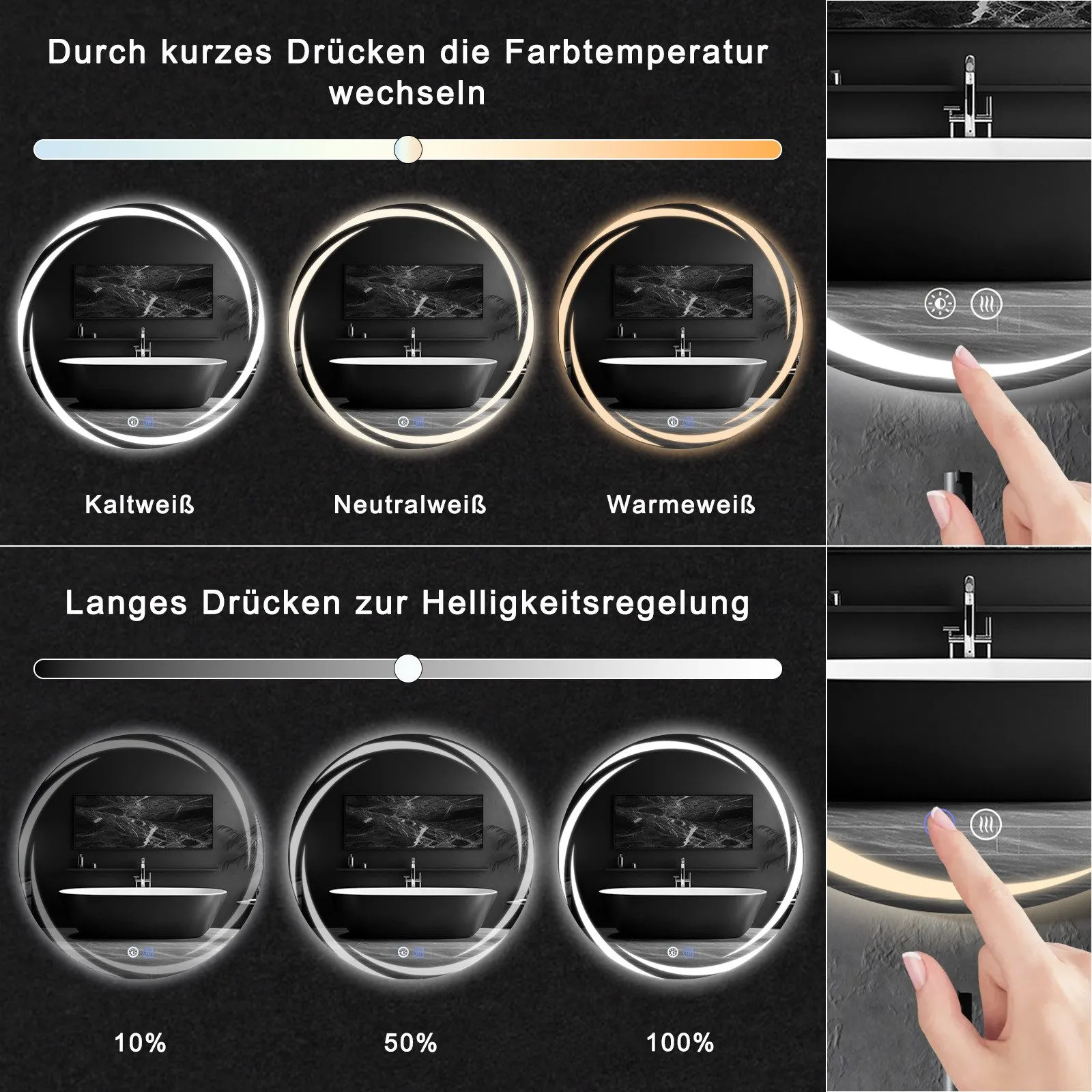 Le variateur tactile propose trois teintes au choix, du blanc chaud au blanc froid (3000 K, 4000 K, 6500 K), pour ajuster l'ambiance selon la tâche, avec transition rapide entre les couleurs de lumière et réglage continu de 10 % à 100 %. L'anneau LED offre un halo régulier qui limite les ombres sur le visage, utile pour le rasage ou le maquillage. La commande tactile centralise les actions d'allumage, de sélection de teinte et de gradation, simplifiant l'usage au quotidien.