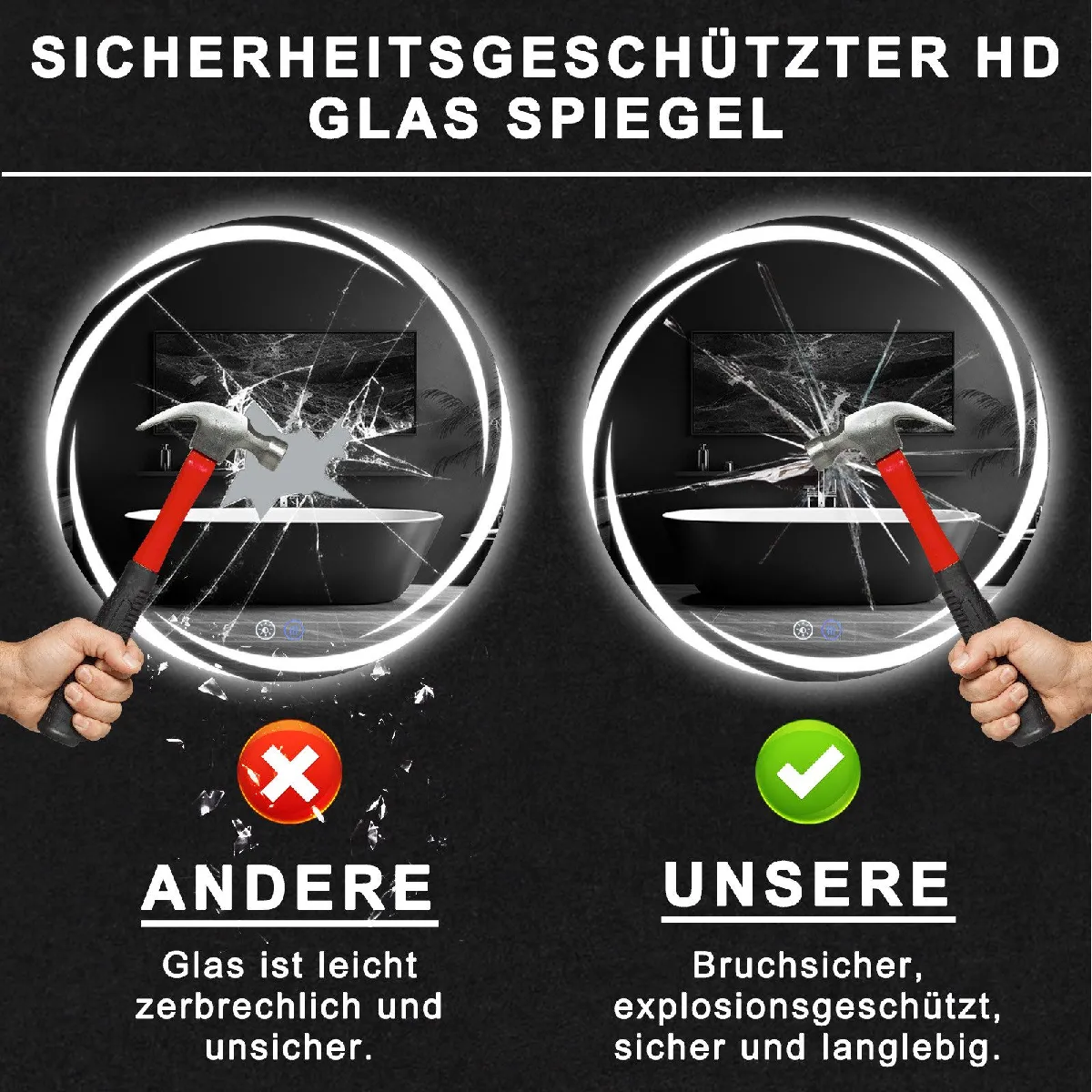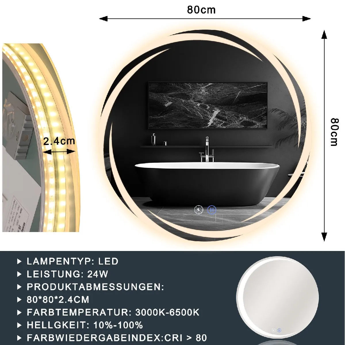 La fonction antibuée maintient la surface nette après une douche, évitant d'essuyer le verre. L'indice de protection IP44 aide à préserver les composants contre les éclaboussures près du lavabo, pour une utilisation adaptée à la salle de bain. Le miroir rond de 80 cm s'accorde à un intérieur contemporain, tandis que le verre antidéflagrant multicouche renforcé améliore la résistance aux chocs et la sécurité pour une mise en place plus sereine dans un espace fréquenté.
