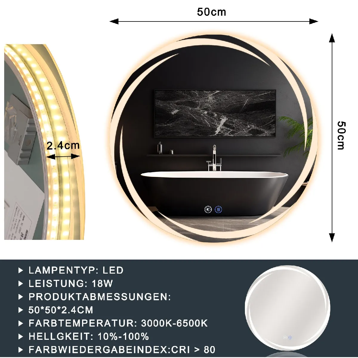 L'éclairage réglable offre une visibilité homogène pour les soins quotidiens, tandis que la surface antibuée et l'indice IP44 assurent une utilisation immédiate après la douche. Grâce à la commande tactile, ce modèle permet une sélection rapide des teintes de lumière et un réglage précis de la luminosité selon le moment de la journée. Le format rond de 50 cm et le cadre gris s'intègrent facilement aux ambiances contemporaines, et la structure en verre antidéflagrant haute résolution renforce la sécurité dans la pièce d'eau. L'alimentation électrique garantit une mise en route stable et une expérience d'éclairage cohérente à chaque utilisation.