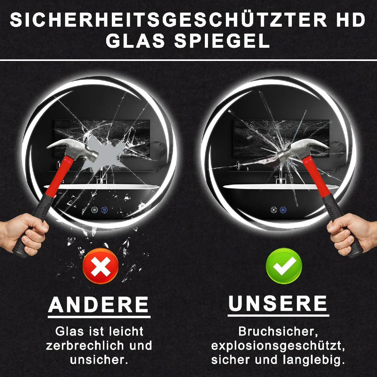 Le verre antidéflagrant haute résolution est conçu en matériau multicouche ou renforcé pour une meilleure résistance aux chocs et une sécurité accrue en cas d'impact. L'indice de protection IP44 protège contre les éclaboussures, ce qui contribue à la fiabilité des fonctions d'éclairage et de désembuage en environnement humide. Son format rond 50 cm, orientation verticale et cadre gris de style moderne aident à harmoniser l'espace, tandis que l'alimentation électrique assure une stabilité lumineuse adaptée aux usages quotidiens.