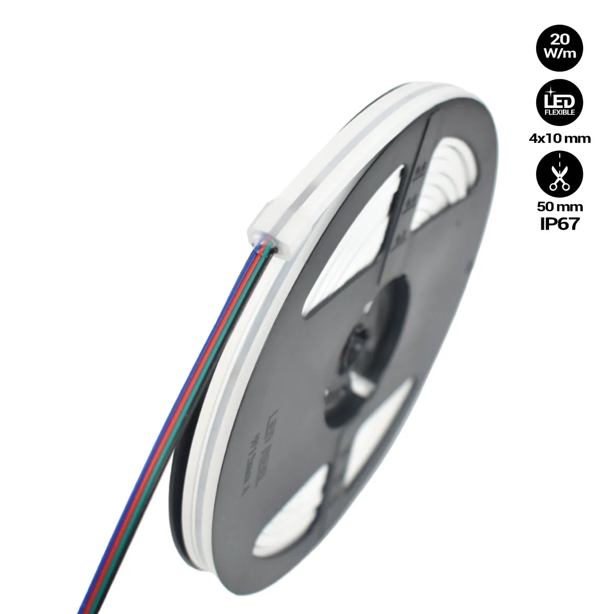 Commentaire vendeur : Le néon LED RGB flexible est doté d'un couvercle en silicone avec une finition opale, ce qui permet de diffuser la lumière de la même manière que les anciens néons. Le kit comprend tous les éléments nécessaires à son installation (20 agrafes et 4 caches) qui se fera très facilement et ne nécessitera pas d'outils spéciaux. Ses dimensions sont de 4x10 mm, et il intègre des puces LED SMD2835, offrant une forte luminosité et une grande efficacité. Sa densité de 120 puces/m assure un éclairage homogène sur l'ensemble du produit. Il présente une conception flexible avec la possibilité de couper aux points marqués (tous les 5 cm), lui donnant ainsi une grande polyvalence lorsqu'il s'agit d'assembler des figures. Il s'agit d'un produit résistant fabriqué en silicone neutre, avec une protection contre les UV et un haut indice IP67, offrant ainsi la possibilité d'être utilisé à l'extérieur et garantissant sa durabilité dans des conditions environnementales défavorables. En intégrant la