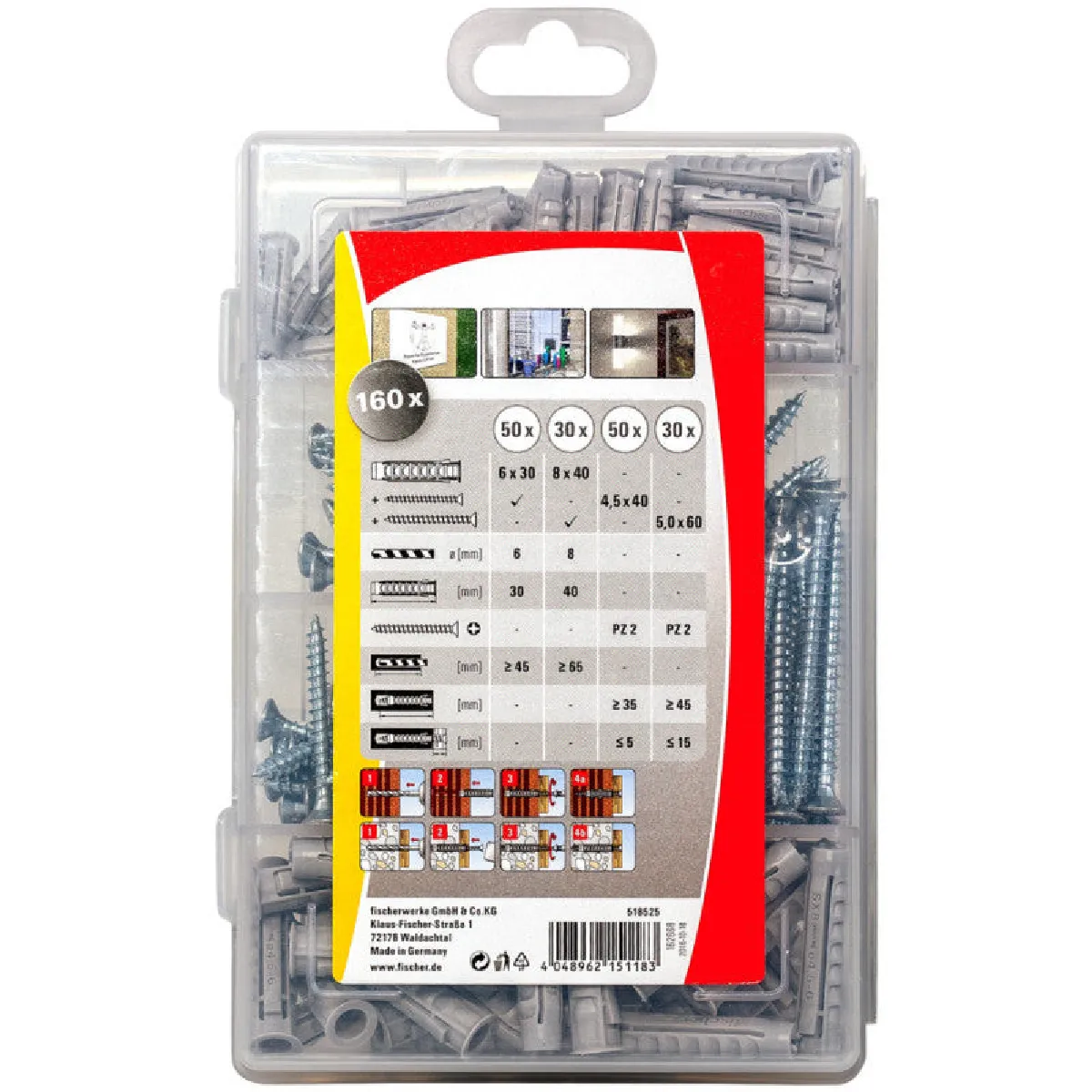 - Jeu de 160 pièces : 50 SX Plus 6 x 30 + 50 vis 4.5 x 40 et 30 SX Plus 8 x 40 + 30 vis 5 x 55