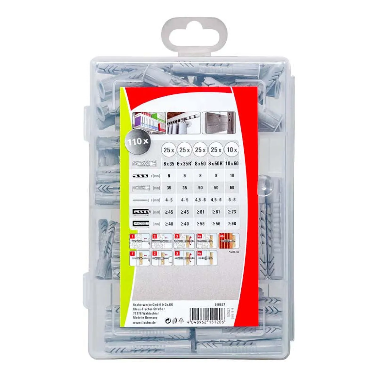 L'assortiment prédéfini inclut UX 6 x 35, UX 6 x 35 R, UX 8 x 50, UX 8 x 50 R et UX 10 x 60, pratique pour des applications courantes telles que lampes, étagères murales et armoires. Le coffret est réutilisable pour un rangement organisé et durable. Adapté à une large plage de matériaux, notamment brique, blocs creux et plaques de plâtre, l'ensemble sécurise les ancrages du quotidien. Le guidage latéral limite les erreurs d'alignement et favorise une mise en uvre rapide et reproductible, avec un accès visuel immédiat grâce au couvercle transparent.