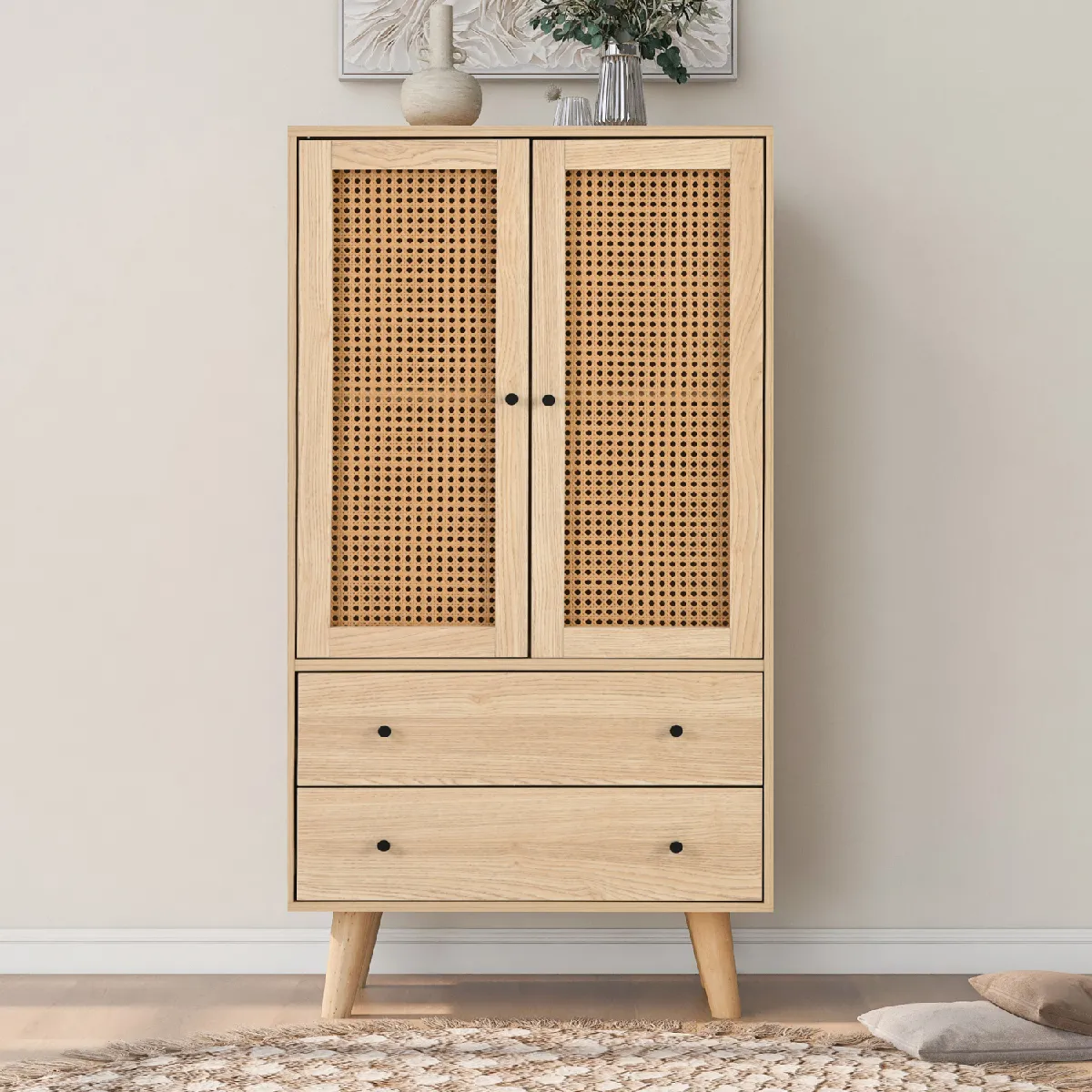 La hauteur de 120 cm et l'encombrement réduit de 60 × 40 cm facilitent l'aménagement d'un coin rangement sans alourdir la pièce. Avec 4 compartiments spacieux pour organiser vaisselle, livres et accessoires, ce buffet s'intègre dans un salon ou une salle à manger au style contemporain. La finition chêne apporte une touche chaleureuse, tandis que les coins arrondis et la structure stable renforcent la sécurité au quotidien. Les portes battantes protègent le contenu de la poussière et gardent un aspect ordonné. La surface lisse se nettoie rapidement avec un chiffon humide, ce qui convient à un usage régulier.