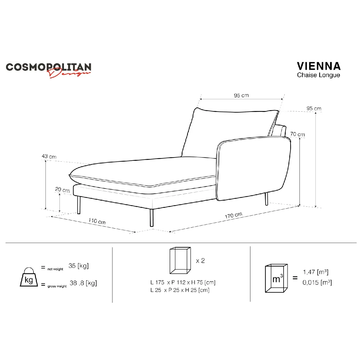 Avec sa forme droite et ses dimensions de 170 × 130 × 95 cm, elle convient à un espace détente individuel tout en laissant circuler la lumière grâce aux pieds en métal doré. La méridienne offre une largeur utile de 95 cm et une profondeur de 130/147 cm pour s'allonger confortablement. L'accoudoir de 15 cm de large à 70 cm de hauteur facilite le confort d'appui. La construction mêlant pin massif, panneaux de meubles, fibres et contreplaqué assure une base robuste, tandis que le poids net de 35 kg facilite la manipulation lors de l'aménagement.
