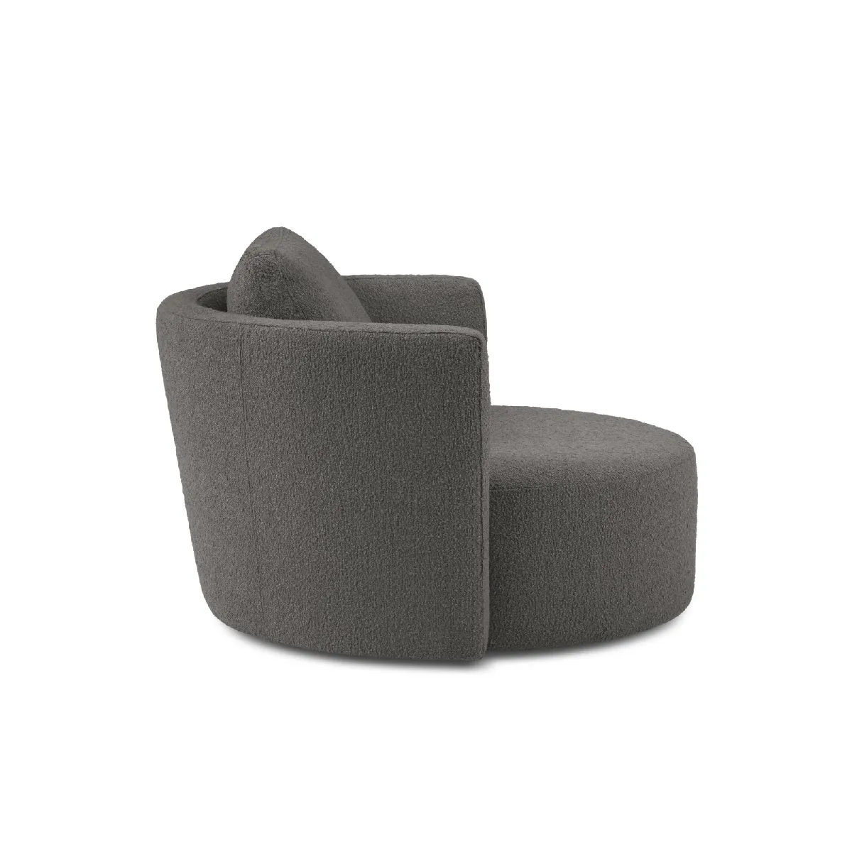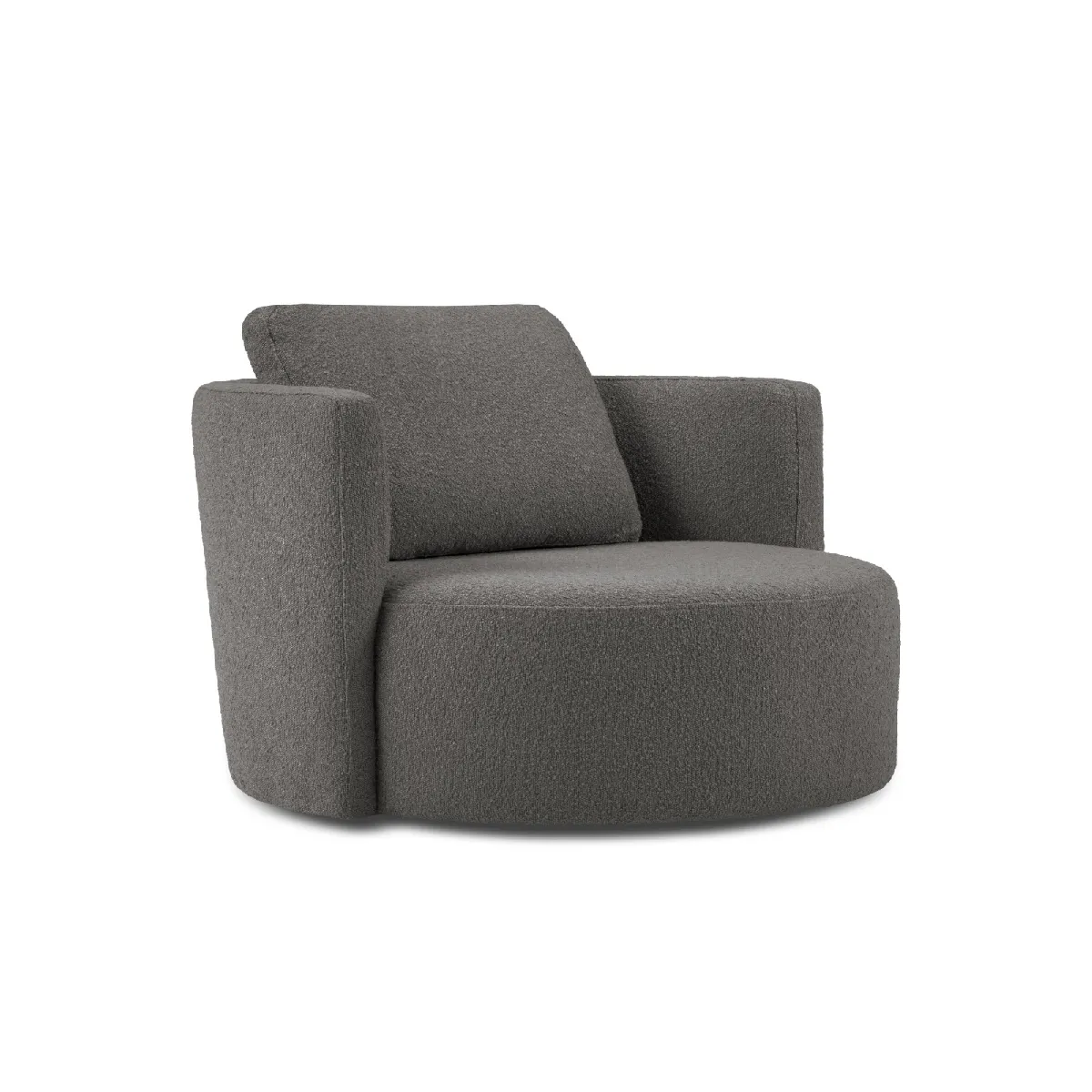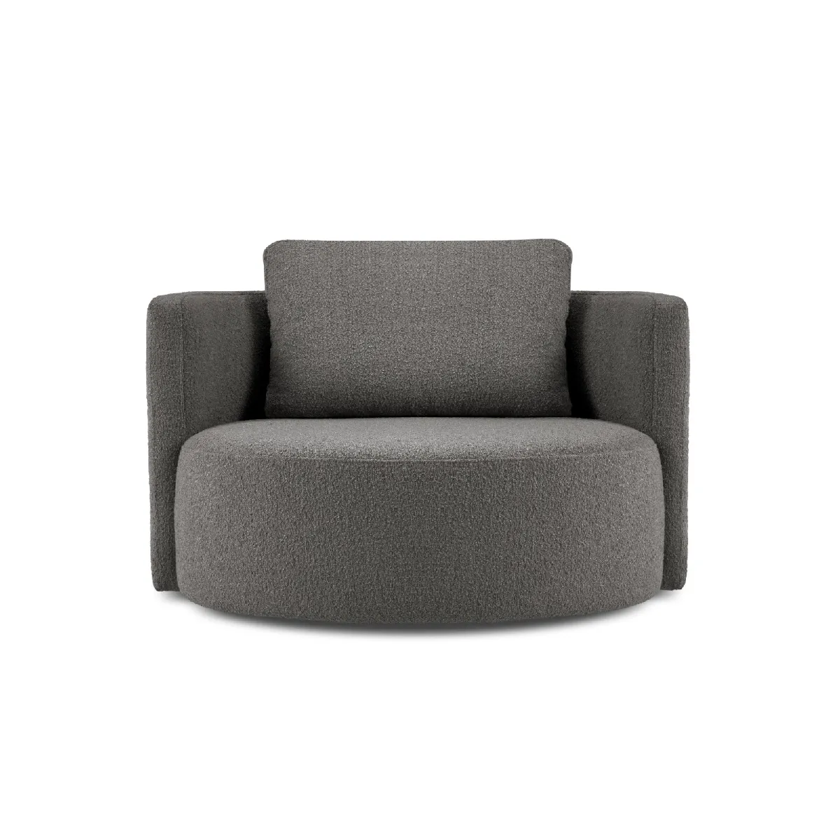 L'assise généreuse invite à s'installer pour lire, discuter ou se détendre, avec une forme ronde minimaliste qui répartit le soutien. Le revêtement en tissu bouclé en polyester apporte une texture chaleureuse et résistante à l'usage quotidien. Le mécanisme pivotant facilite les mouvements pour orienter l'assise vers une table basse ou un point de conversation. Sans têtière ni repose-pieds, ce modèle reste compact pour un salon ou un coin lecture. Le style du meuble est minimaliste avec une silhouette douce et enveloppante, dans une teinte gris foncé facile à associer. La structure supporte jusqu'à 150 kg et s'adapte à un usage régulier au sein d'un foyer.