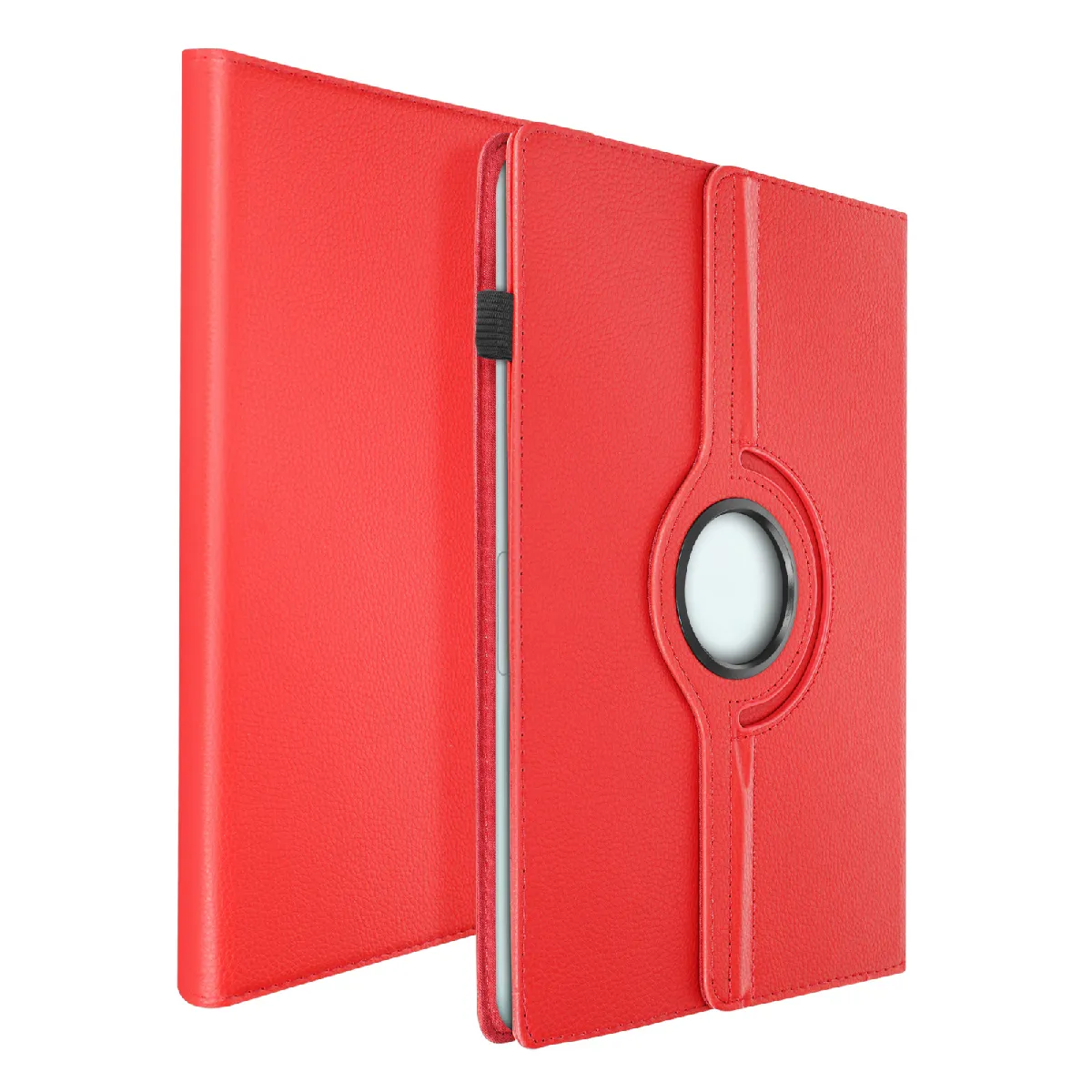 Étui clapet universel pour tablette 13 pouces rouge. Rotatif 360°. Support vidéo. Protection intégrale contre chocs et rayures. Intérieur doux. Fixation élastique. Simili cuir. Usage portrait et paysage. Sécurisé et élégant. Installation simple.