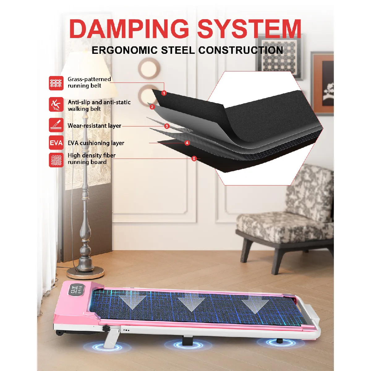 Double système d'amortissement : Équipé d'une bande anti-dérapante à 5 couches, de 8 amortisseurs en silicone et de 2 coussins en caoutchouc souple, ce tapis de course offre un double amortissement pour protéger vos genoux pendant l'utilisation.
