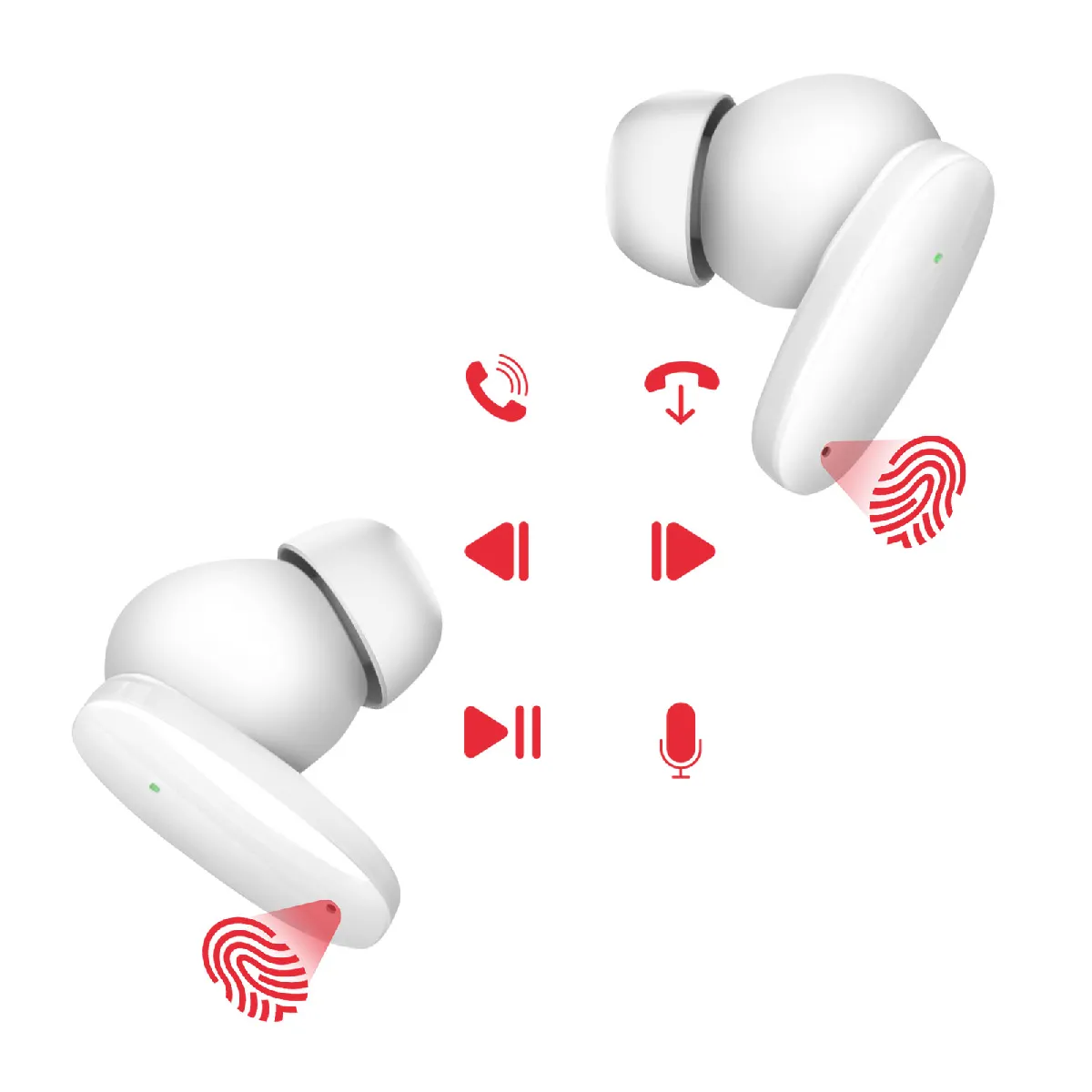 Écouteurs sans fil TWS. Bluetooth 5.3. Autonomie 6 h + boîtier 35 h. Recharge USB-C. Design compact et léger. Batterie boîtier : 230 mAh. Fréquence : 20 Hz - 20 KHz. Poids total : 37 g. Portée : jusqu'à 10 m Temps de charge : 2 h. Câble USB-C inclus.