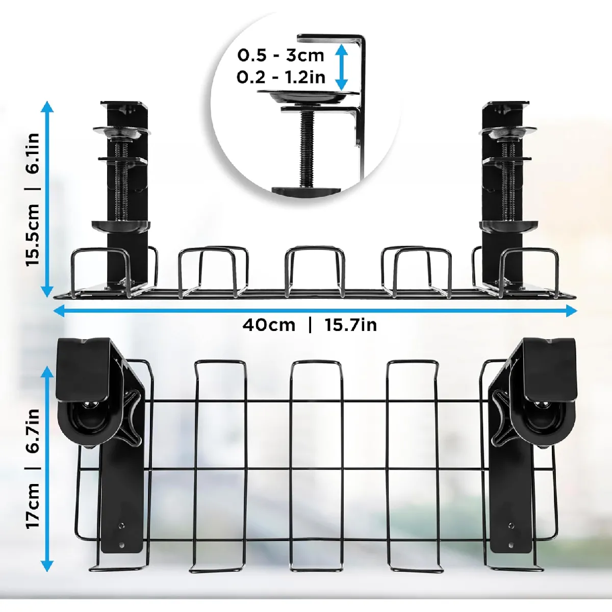 Ce plateau de gestion des câbles est facile à installer sous votre bureau. A l'aide des vis fournies, il suffit de visser le support en place à l'aide des deux pinces. Le CMH2 mesure 40 x 16 x 17 cm et permet de supporter une charge maximale de 10 kg.