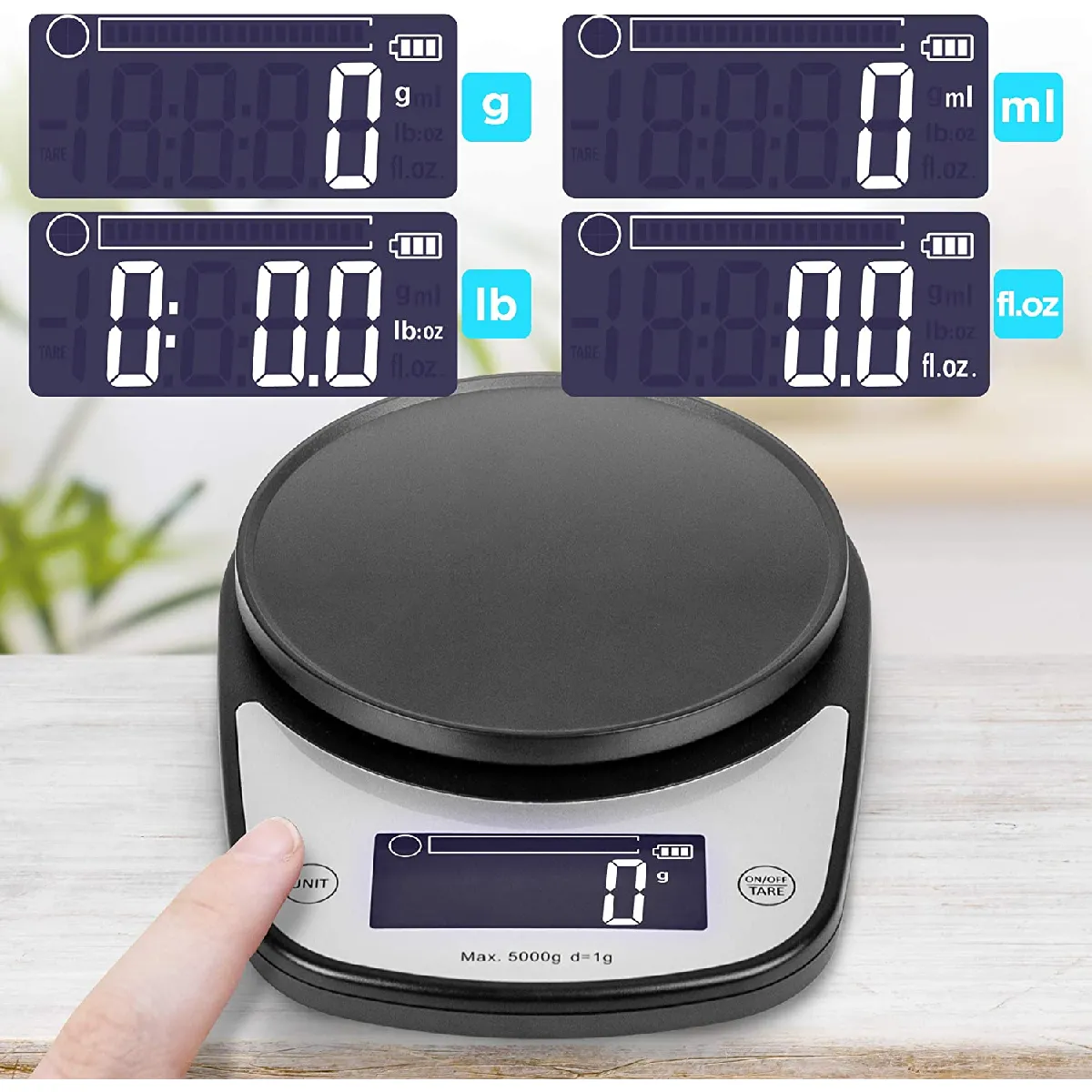 Caractéristiques. Taille de la surface: 19.4 x 13.8 x 3 cm. Couleur: noir. Taille du bol: 22 x 10.5 cm. Capacité du bol: 2.5 litres. Bol amovible. Capacité de pesée maximale: 5 kg. Poids: 440 g. Unités: grammes (g), millilitres (ml), livres et onces (lb.oz) et onces liquides (fl.oz). Piles: 2 x AAA (incluses).