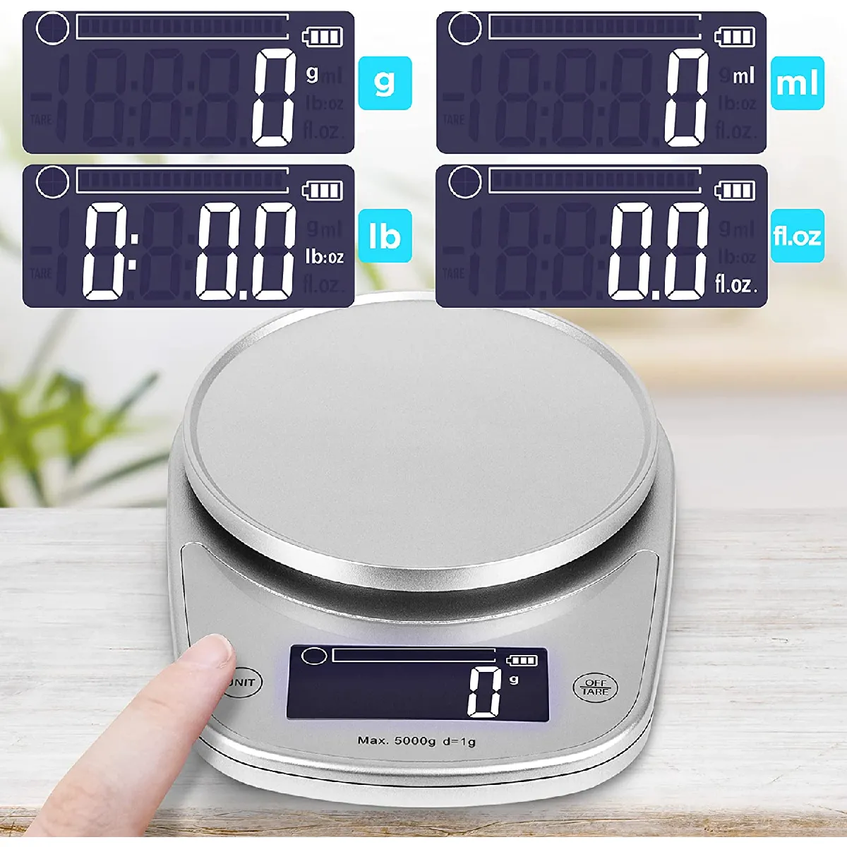 Caractéristiques. Taille de la surface: 19.4 x 13.8 x 3 cm. Couleur: argenté. Taille du bol: 22 x 10.5 cm. Capacité du bol: 2.5 litres. Bol amovible. Capacité de pesée maximale: 5 kg. Poids: 620 g. Unités: grammes (g), millilitres (ml), livres et onces (lb.oz) et onces liquides (fl.oz). Piles: 2 x AAA (incluses).