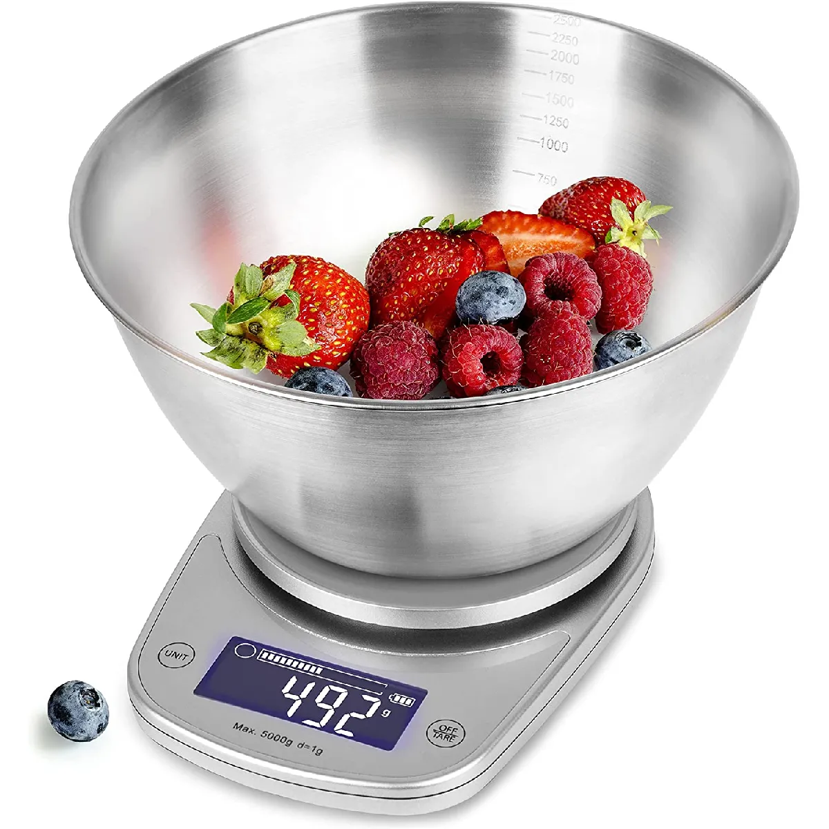 Duronic KS5000 SRSS Balance de Cuisine d'une capacité de 5 kg | Précision à 1 g | Bol en inox de 2.5 L inclus | Large écran LCD | Fonction d'ajout de poids TARE | Idéale pour la pâtisserie