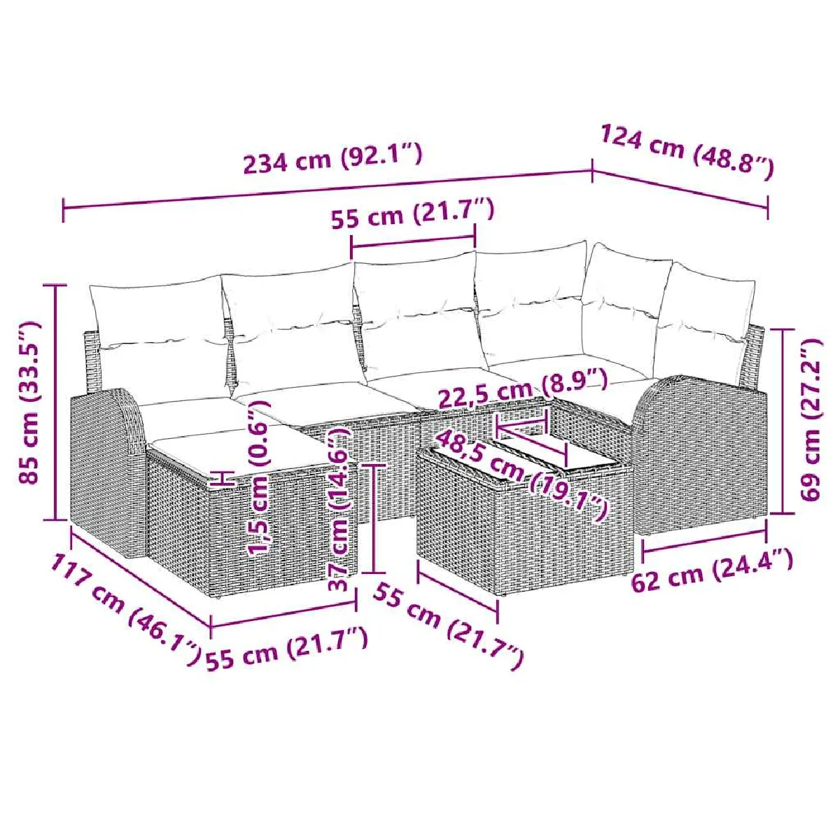 - Composants polyvalents : Les dossiers confortables et les accoudoirs arrondis de chaque pièce rendent l'assise agréable. Tu peux configurer le tout comme tu veux pour répondre à tes besoins d'aménagement extérieur.