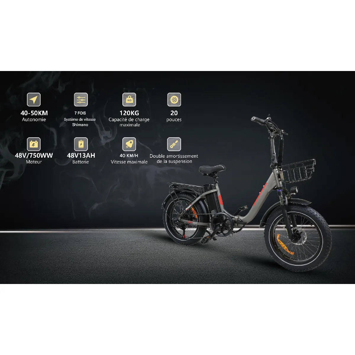 BowAI Vélo Électrique Pliable 20", Moteur 48V/750W, Batterie Amovible 48V13Ah, 7 Vitesses SHIMANO, Freins à Disque, 40-50 km, Gris