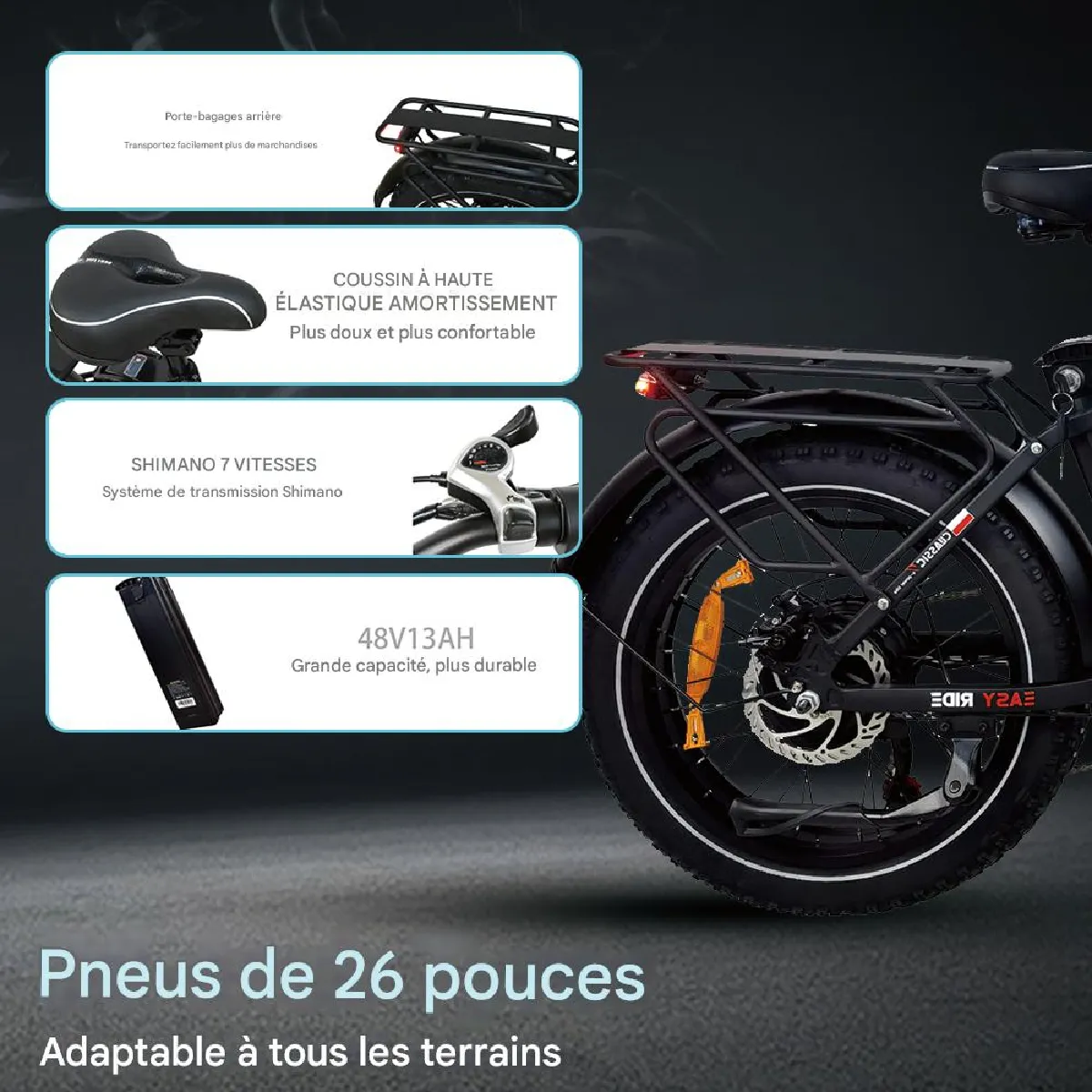Moteur Puissant 48V/750W et Autonomie Exceptionnelle -Notre vélo électrique est équipé d’un moteur 750W 48V offrant une vitesse maximale de 40 km/h. Grâce à sa batterie 48V13AH, profitez d’une autonomie de 40 à 50 km. Vous pouvez parcourir de longues distances sans souci tout en bénéficiant d’une puissance incroyable pour une conduite agréable.