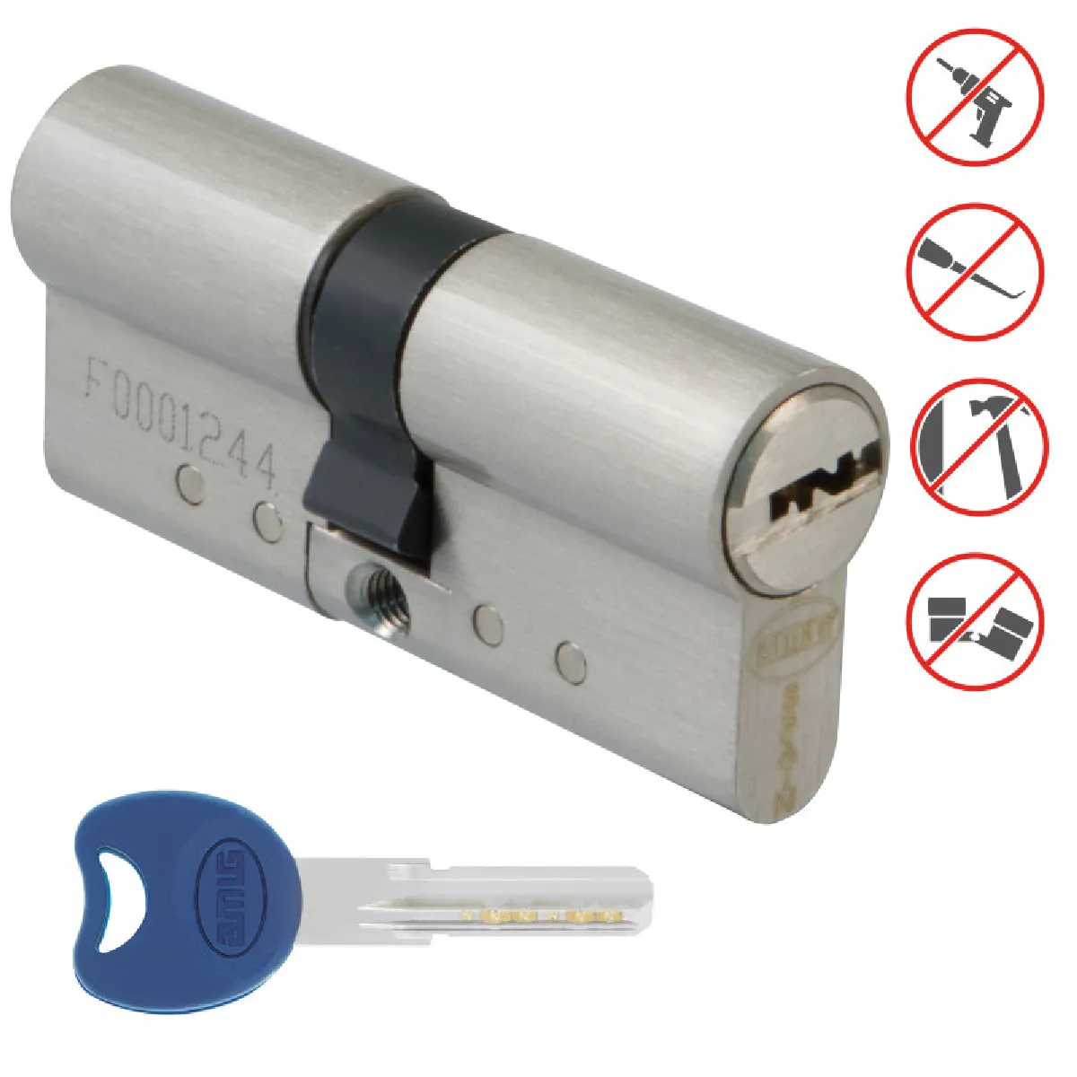 Le système anti-crochetage et anti-bumping élève le niveau de résistance face aux manipulations non autorisées. Le cylindre est codé et livré avec une carte de propriété pour le contrôle de la reproduction des clés, ainsi que 5 clés à tête plastique. Pour une pose fiable, le cylindre installé ne doit pas dépasser de plus de 1 mm. Un entretien périodique est recommandé tous les 5000 cycles avec lubrifiant AMIG ou WD-40 pour préserver la fluidité. Dimensions 70 mm (35-35), couleur chromé mat, non connecté.