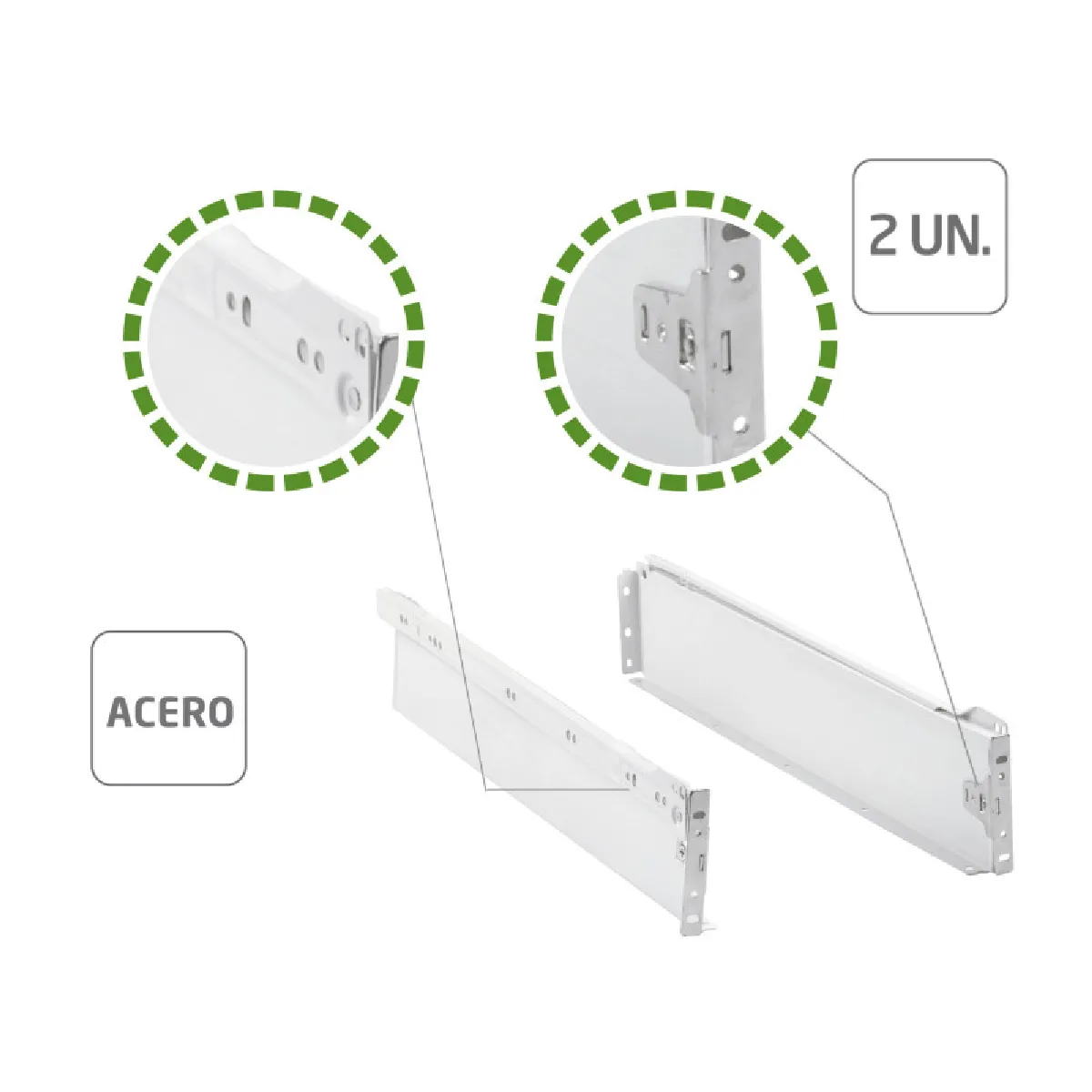 La structure en acier peint assure une bonne rigidité et une tenue dans le temps adaptée aux usages domestiques. Le front réglable en hauteur simplifie l'alignement des façades, utile lors du remplacement de quincaillerie ou d'un montage neuf. La désignation 86 x 500 mm correspond à un format courant pour meubles de cuisine, salle de bain ou bureau, permettant une mise à niveau rapide d'un coulissage existant. Le conditionnement à l'unité convient au remplacement ponctuel ou à un montage au cas par cas.