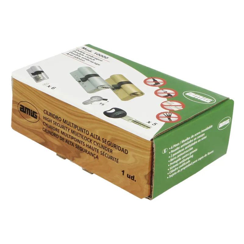 Commentaire vendeur : Cylindre haute sécurité en laiton, 6 goupilles et came de 15 mm. Double embrayage. 1 goupille anti-perçage sur le corps et 2 sur le rotor. Barre anti-extraction et anti-cassure en acier inoxydable. Protégé contre le crochetage. Système anti-bumping. Ressort en acier inoxydable. Cylindre codé avec carte de propriété pour copie de clés. Avec 5 clés à tête plastique. Une fois installé, le cylindre ne doit pas dépasser de plus de 1 mm. Utilisez du lubrifiant AMIG ou WD-40 tous les 5000 cycles.