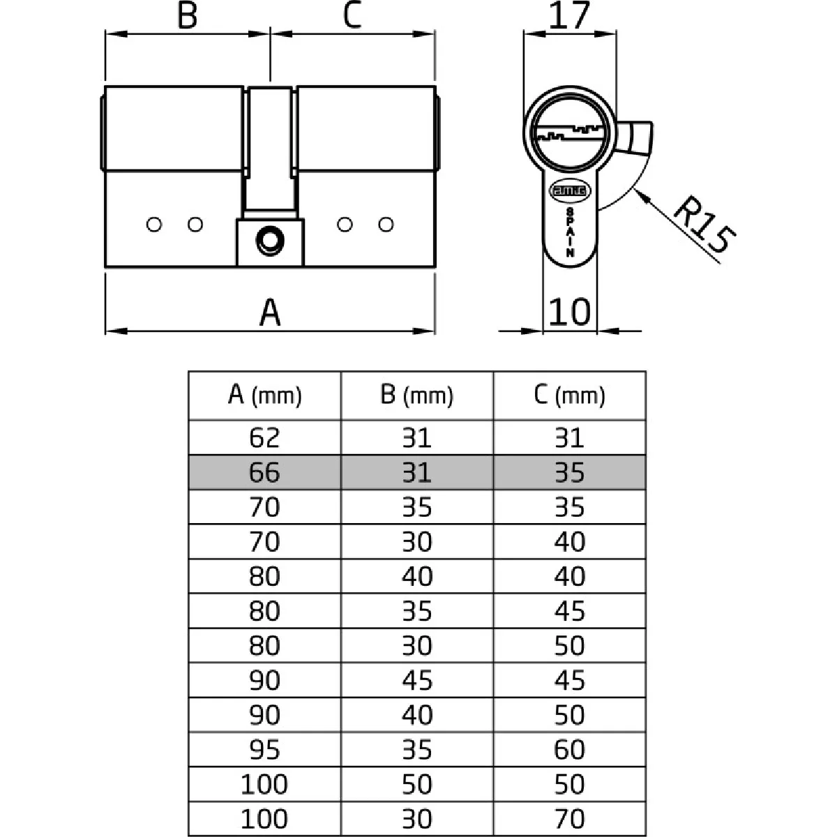 Ce modèle à 2 entrées de clé est codé et livré avec une carte de propriété pour la reproduction des clés, ainsi que 5 clés à tête plastique. La came de 15 mm facilite l'intégration sur de nombreuses portes. Pour un montage correct, le cylindre ne doit pas dépasser de plus de 1 mm en façade. Un entretien périodique avec lubrifiant approprié est recommandé tous les 5000 cycles afin de préserver un fonctionnement fluide et constant. Dimensions : axe 66 mm (31-35), diamètre 17 mm, hauteur 40 mm, largeur 70 mm, longueur 66 mm.