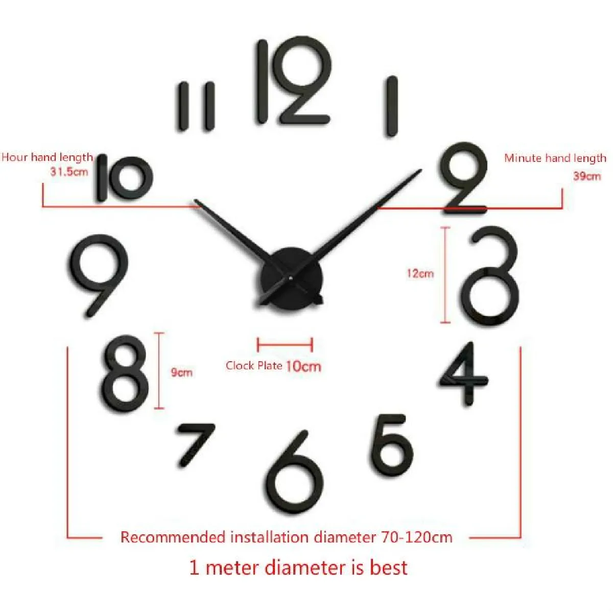 - Dimensions : aiguille des minutes 39 cm, aiguille des heures 31,5 cm, diamètre du cadran 10 cm, diamètre d'installation recommandé 70-120 cm