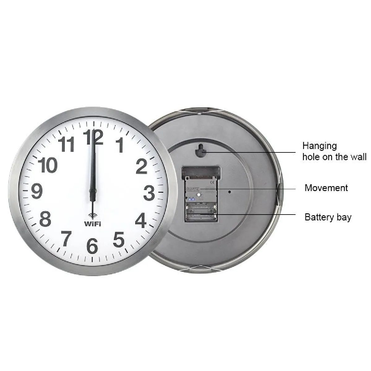 - Caractéristiques : esthétique et pratique, aiguille peinte, couleur uniforme, insertion manchon en cuivre, robuste et durable, coque en métal, processus de filage en alliage d'aluminium, finition exquise, texture métallique forte, synchronisation automatique de l'heure par WIFI, arrêt automatique de la trotteuse de 0h à 6h pour économiser l'énergie