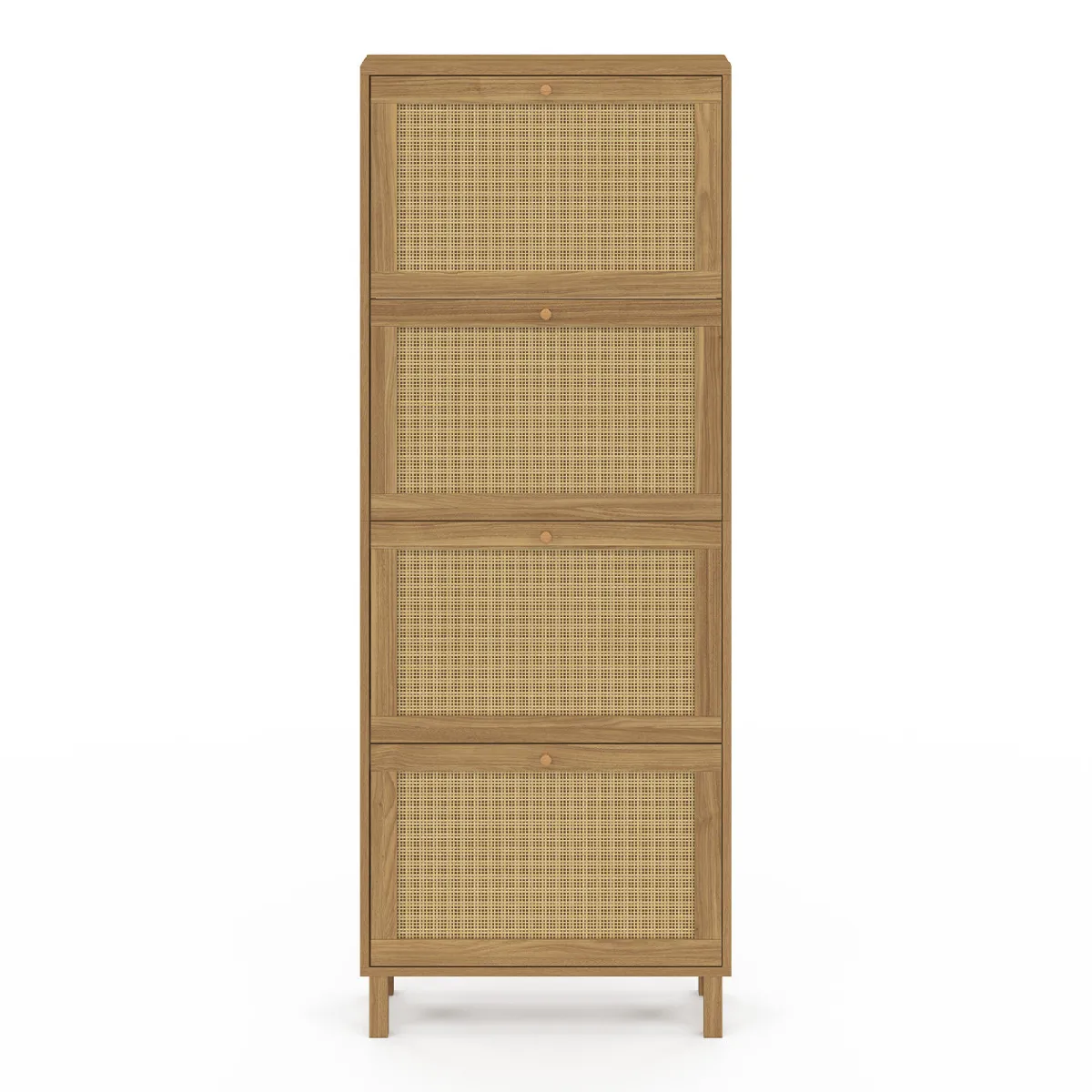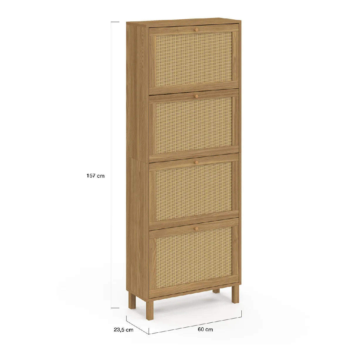 Apportez un esprit naturel et élégant à votre entrée avec ce joli meuble à chaussures HANAE 4 portes effet cannage. Les façades en cannage plastique apporteront une touche chaleureuse et lumineuse dans votre entrée et s'intégreront parfaitement dans tous les types d'intérieurs ! Pratiques et fonctionnels, ses 4 compartiments dotés chacun d'une cloison intermédiaire offrent une grande capacité de rangement et peuvent accueillir jusqu'à 24 paires de chaussures, soit 6 paires par compartiment.De plus, les dimensions compactes de ce meuble seront parfaites pour optimiser votre entrée ou même votre dressing laissant vos chaussures à l'abri des regards et de la poussière pour un espace toujours ordonné !Ses 4 pieds en bois et sa structure en panneaux de particules vous garantissent stabilité et robustesse.Vous n'aurez plus qu'à poser de jolis objets décoratifs ou de petites plantes vertes sur le dessus du meuble et le tour et joué !Dimensions du meuble à chaussures vintage HANAE 4 portes effet cannageDimensions globales : Longueur 60 cm x largeur 23,5 cm x Hauteur 157 cmHauteur pieds : L. 3 x l .3 x H. 10cmDimensions façade portes : L. 56 x H. 34 cmEncadrement porte : 4 cm4 portes battantesMatériaux : Panneaux de particules et cannage synthétiqueColoris : boisÀ monter soi-même Retrouvez l'ensemble de notre collection cannage ainsi que l'ensemble de nos meubles d'entrée sur notre boutique en ligne !