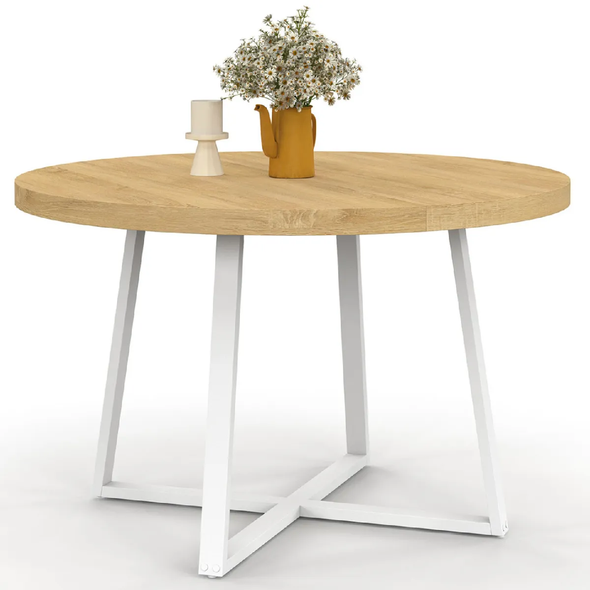 Dotée d'un design industriel et moderne, la table à manger SELMA incarne l'harmonie entre esthétique et fonctionnalité. Avec son diamètre de 110 cm, cette table ronde peut accueillir confortablement 4 à 6 personnes faisant d'elle le choix parfait pour un repas en famille ou entre amis. Sa forme ronde encourage la convivialité en créant un espace où chaque invité peut interagir facilement avec les autres.La couleur bois de son plateau associée aux pieds en métal blanc apportera un caractère authentique et chaleureux à votre intérieur. De plus, le design travaillé des pieds lui confère un look ultra tendance ! Que vous ayez un intérieur moderne ou plus classique, la table ronde SELMA s'intégrera parfaitement grâce à son design intemporel. Dans une salle à manger ou dans une cuisine, elle sera idéale pour créer un espace repas moderne et chaleureux ! Vous pouvez, par exemple, l'associer avec le lot de 4 chaises TAHLYA en velours gris foncé disponible sur notre site.Dimensions de la table à manger ronde SELMA bois et blanc 110 cmDimensions globales : Longueur 110 cm x largeur 110 cm x Hauteur 75 cmDimensions pieds : 5 x 2,5 cmEpaisseur du plateau : 5 cm Matériaux : Particules de bois mélaminé et métalColoris : bois et blancCapacité : 4-6 personnesÀ monter soi-mêmeDécouvrez également toutes les tables à manger et retrouvez l'ensemble de notre collections industrielle sur notre boutique en ligne !