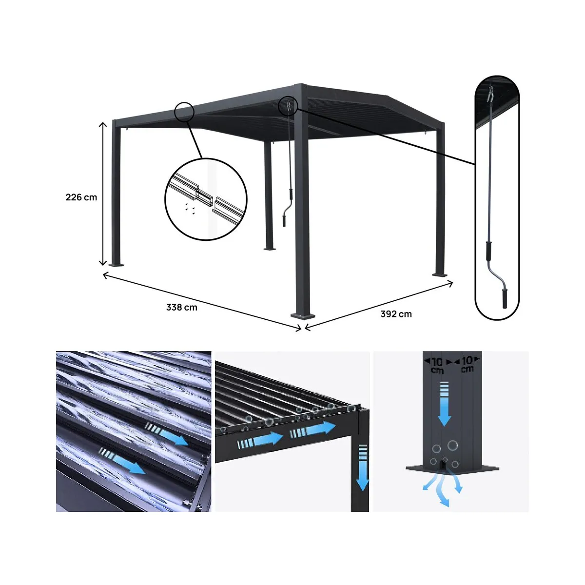 Pergola bioclimatique "Victoria" en aluminium et métal- 3,5 x 4 m - Gris Ajoutez une touche d'élégance à votre extérieur avec notre pergola en métal et aluminium, idéale pour votre patio ou terrasse. Résistante aux intempéries, elle vous offre un espace confortable et modulable grâce à son toit étanche et ses lattes inclinables, que vous pouvez ajuster facilement à l'aide d'une manivelle.Sa structure bioclimatique régule l'ombre et la lumière, tout en vous protégeant de la pluie, des UV et de la neige. La pergola est une installation permanente car elle est à fixer dans le sol. Pas besoin de la ranger en hiver, vous pourrez en profiter tout au long de l'année. Elle s'intègre harmonieusement à tous les styles et est idéale pour abriter un spa par exemple. Confort, design et durabilité au rendez-vous !Pergola bioclimatique toit en V "Victoria" en aluminium et métal - 3,5 x 4 m - Dimensions : 338 x 392 x 242 cm - Gris - Poids : 145 kg - Possibilité de réguler l'ombre et la lumière. .Descriptif: Pergola bioclimatique Victoria en aluminium et métal - 3 x 6 m - Dimensions : 338 x 392 x 242 cm - Gris - Poids : 145 kg - Possibilité de réguler l'ombre et la lumière.