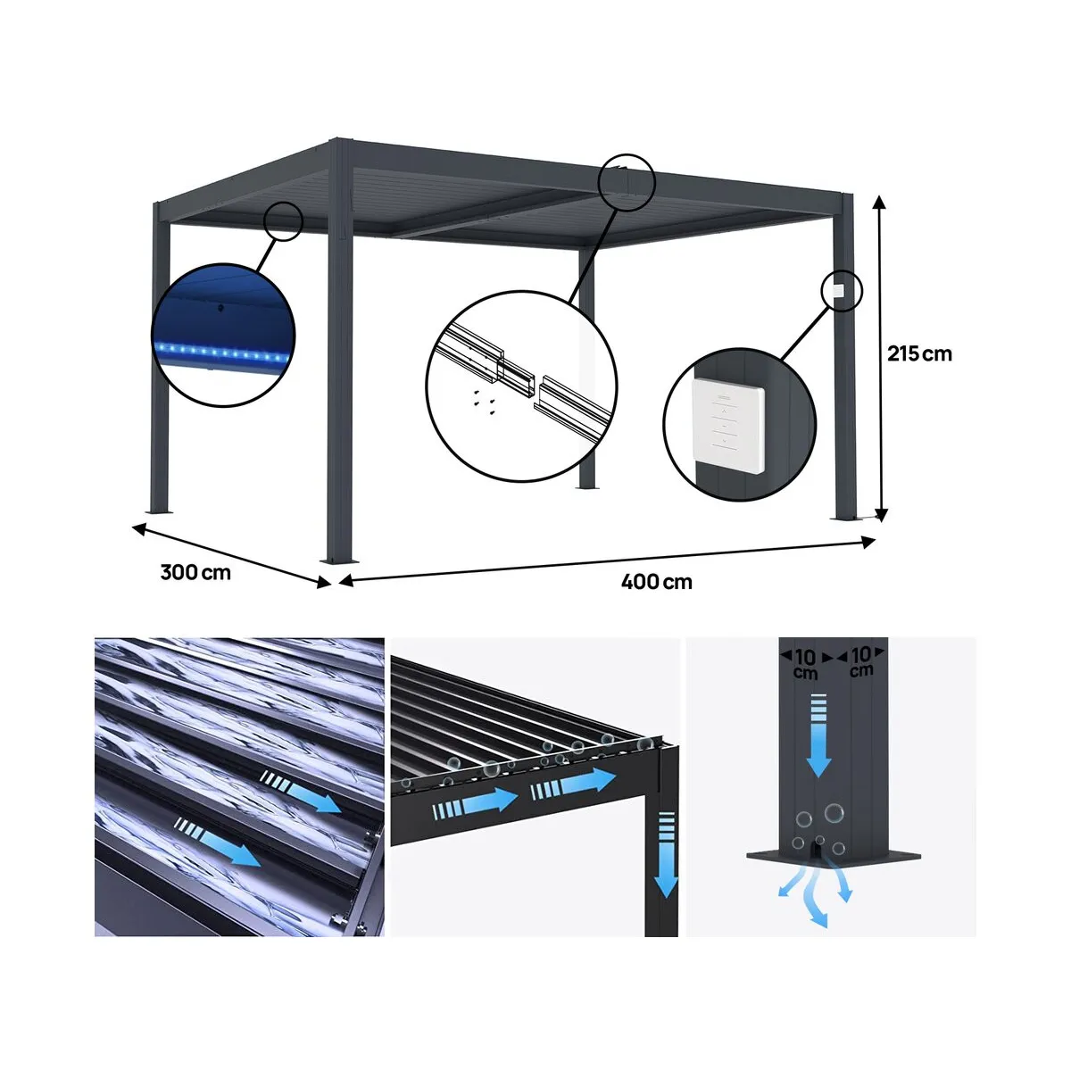 Commentaire vendeur : Pergola bioclimatique en aluminium - Electrique - LED intégrée tout autour de la pergola - Dimensions :300 x 400 x 220 cm - Matières : aluminium - Gris foncé