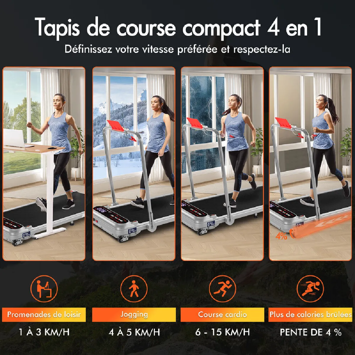 Ce tapis de course pratique, placé sous le bureau, peut également vous aider à rééquilibrer vos postures assises et debout, vous permettant ainsi d'intégrer plus de mouvement à votre quotidien. Nul besoin de marcher toute la journée pour être au top de vos performances sur route et sur sentier ; ce tapis de marche vous permet de rester actif lorsque vous envoyez des e-mails ou assistez à des réunions, stimulant ainsi votre métabolisme et votre condition cardiovasculaire à chaque pas. Que vous travailliez debout au bureau ou que vous souhaitiez rester actif devant la télévision à la maison, notre tapis de marche vous permet d'atteindre vos objectifs quotidiens de pas, que vous travailliez ou que vous receviez des amis.