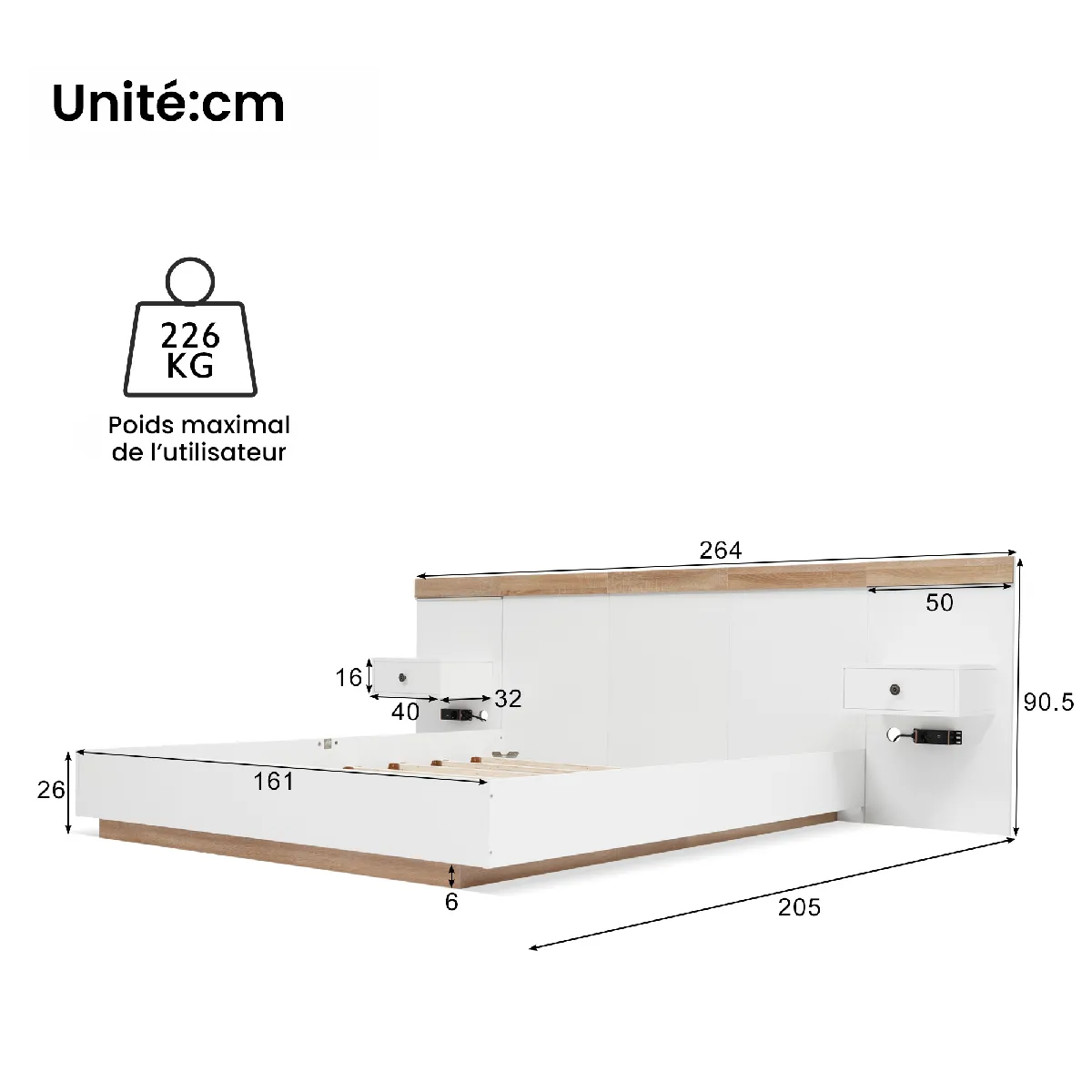 - Hauteur du pied de lit : 26 cm