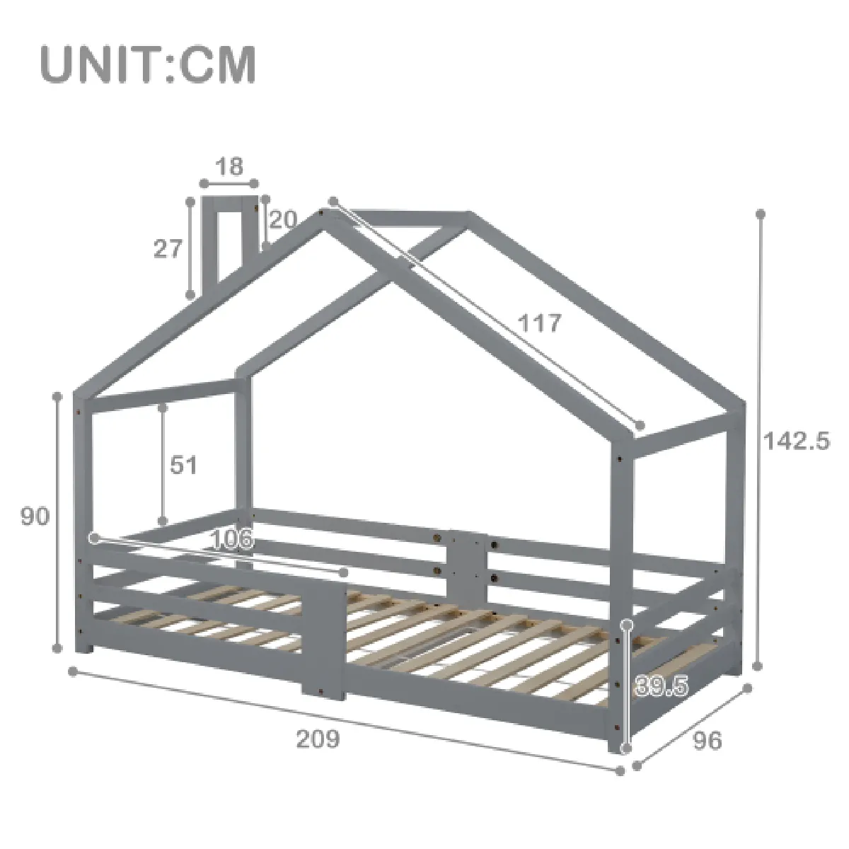 Lit cabane 90x200 cm, lit enfant, lit simple, cadre de lit, gris. Pour éviter de nuire à vos enfants à cause des odeurs chimiques, nous avons utilisé des peintures à base d'eau presque inodores. Un matériel robuste peut connecter fermement tous les accessoires ensemble. La jolie petite forme de maison donne à la chambre des enfants une atmosphère animée. Il n'y a pas de limites à votre imagination, vous pouvez décorer le lit maison avec votre bébé. La décoration de la cheminée sur le toit est un point fort. 15 sommiers à lattes rigides offrent un soutien suffisant au développement de la colonne vertébrale. Le poids maximum est de 120 kg. Sans matelas.
