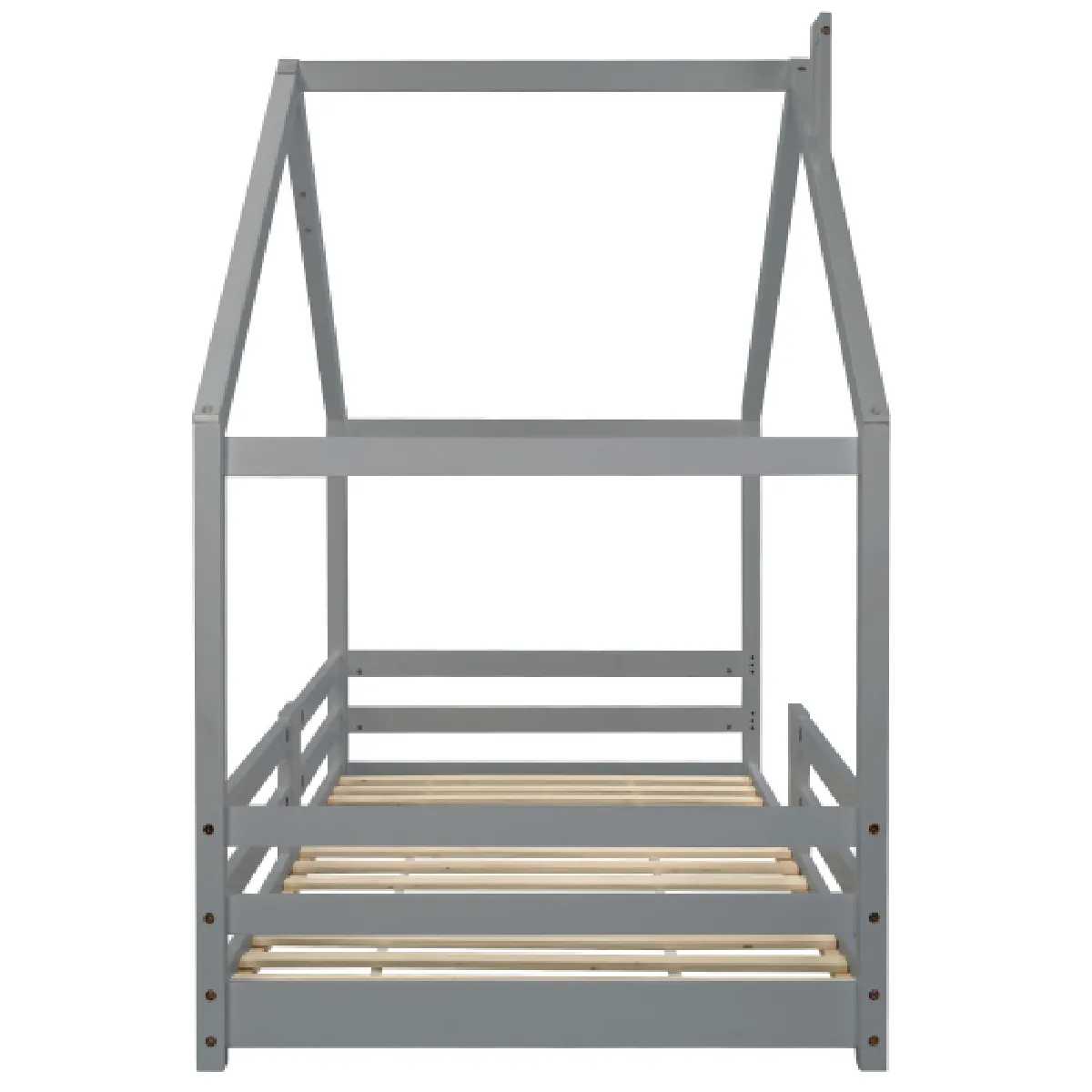 Lit cabane 90x200 cm, lit en bois pour enfants avec cheminée, protection antichute, sans matelas, gris