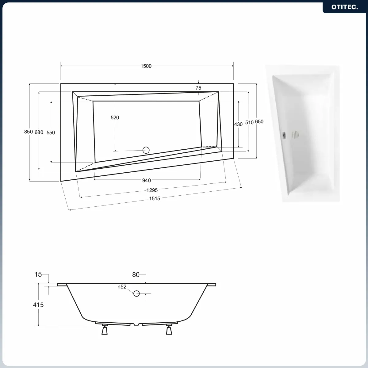 x1 - BAIGNOIRE ASYMÉTRIQUE - 150 x 85 CM - GAUCHE - INTIMA SLIM