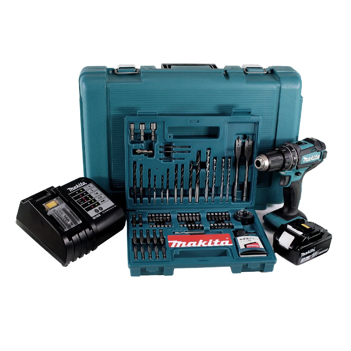 Makita DHP 482 SFK Perceuse-visseuse à percussion sans fil 18V 62Nm + 1x Batterie 3,0Ah + Chargeur + 100x pièces Ensemble Foret + Coffret de transport
