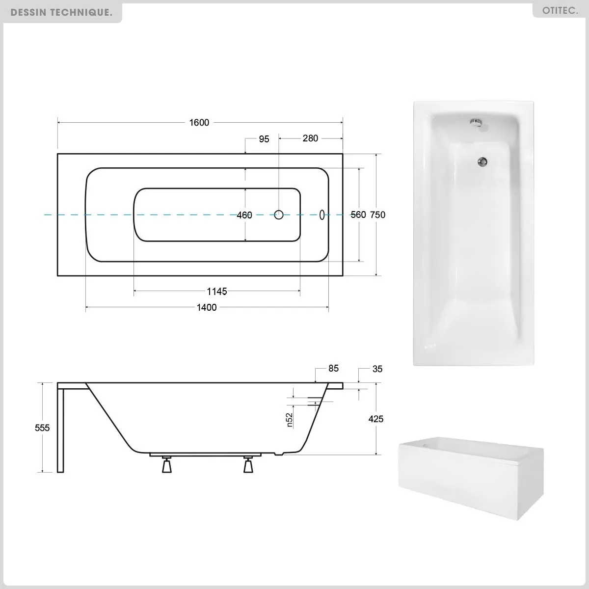 x1 - BAIGNOIRE RECTANGULAIRE - 160 X 75 CM - TALIA