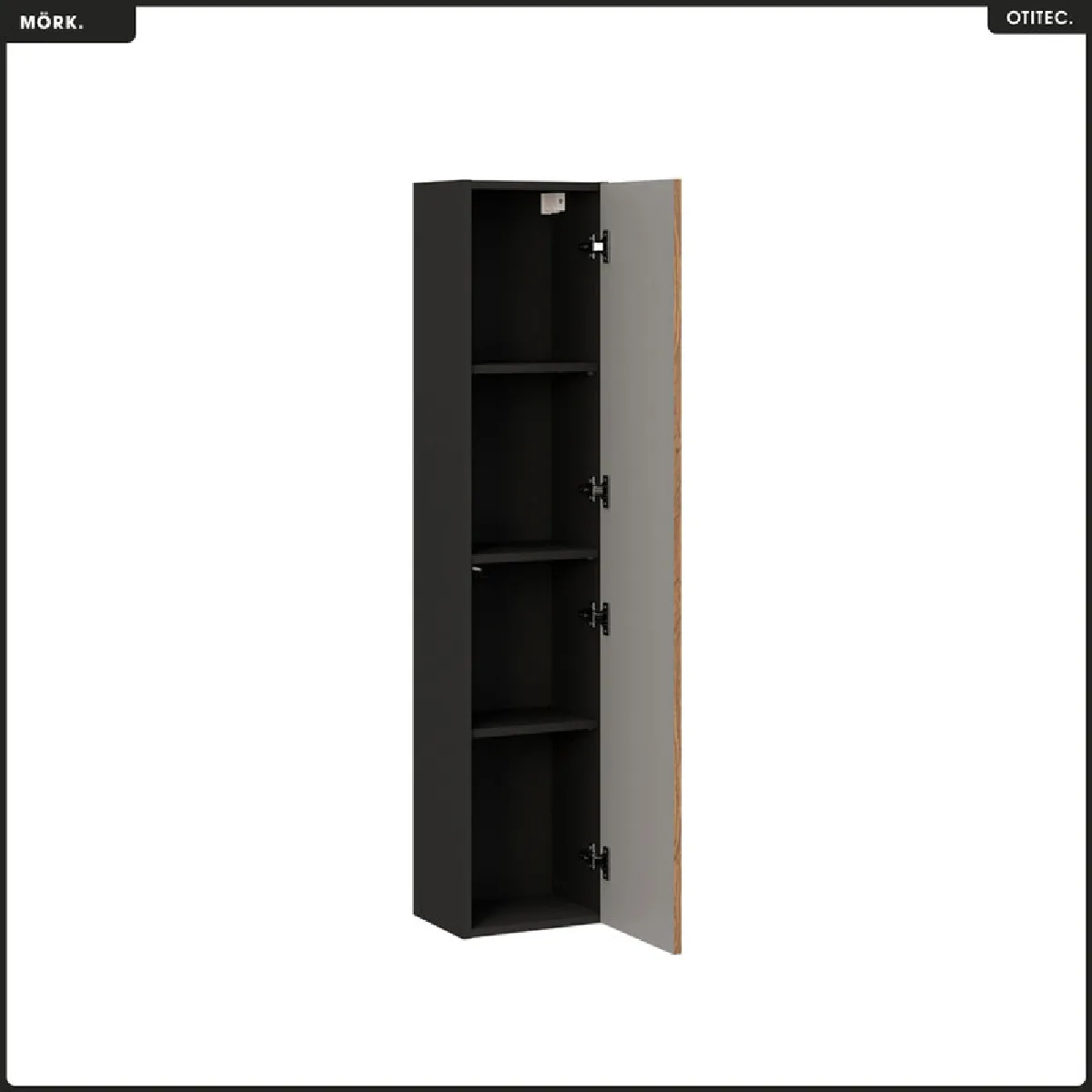 La façade à cadre fraisé en MDF avec décor chêne naturel apporte une présence visuelle discrète et chaleureuse, tandis que le corps noir mat souligne une ligne contemporaine. La hauteur de 140 cm permet d'exploiter la verticalité pour libérer le plan vasque et les zones de passage. Les trois étagères offrent des niveaux dédiés aux soins quotidiens, au linge de toilette ou aux réserves, pour maintenir une salle de bain ordonnée au quotidien. La porte unique limite l'exposition à l'humidité ambiante et protège les produits des éclaboussures.