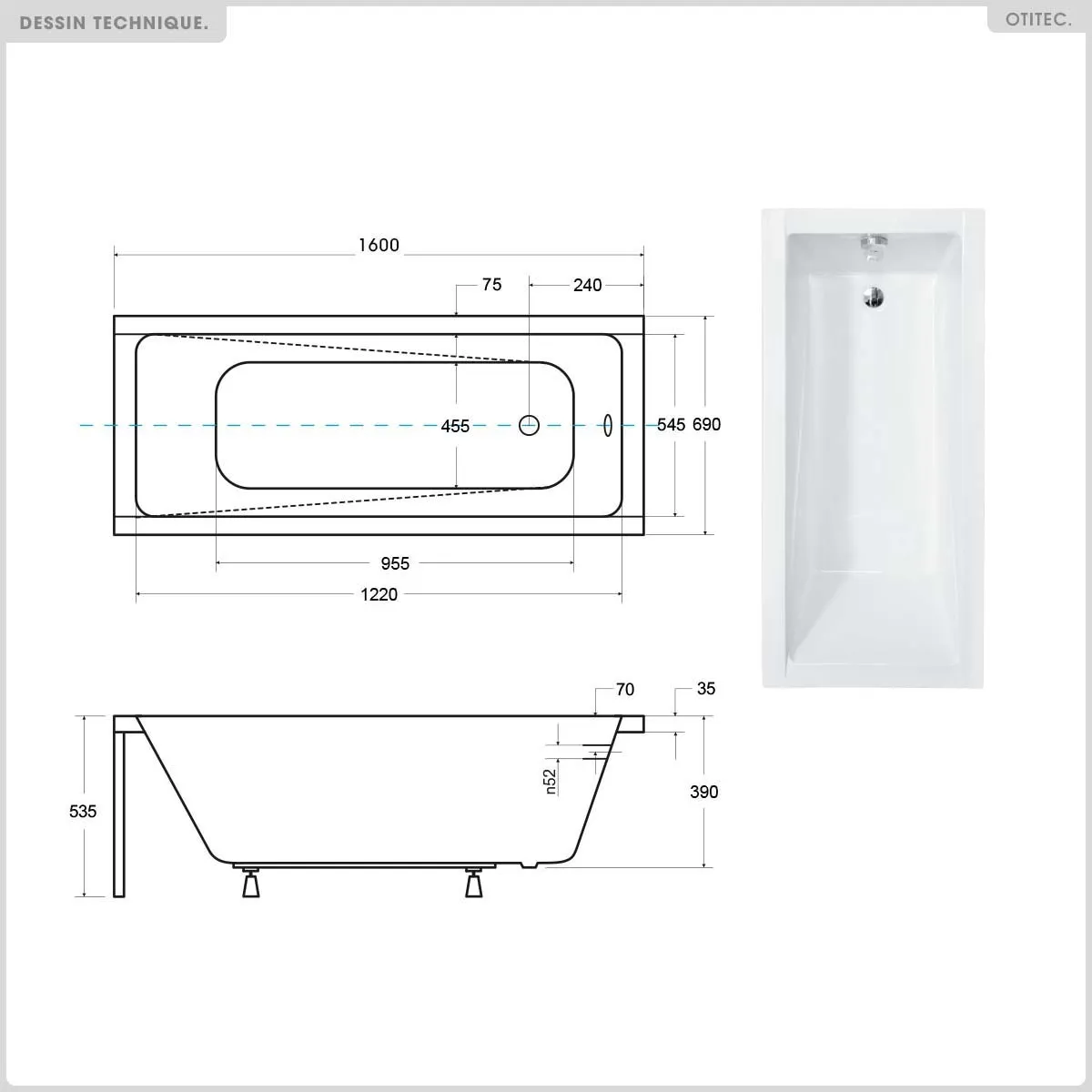 x1 - BAIGNOIRE RECTANGULAIRE - 160 X 70 CM - MODERN SLIM