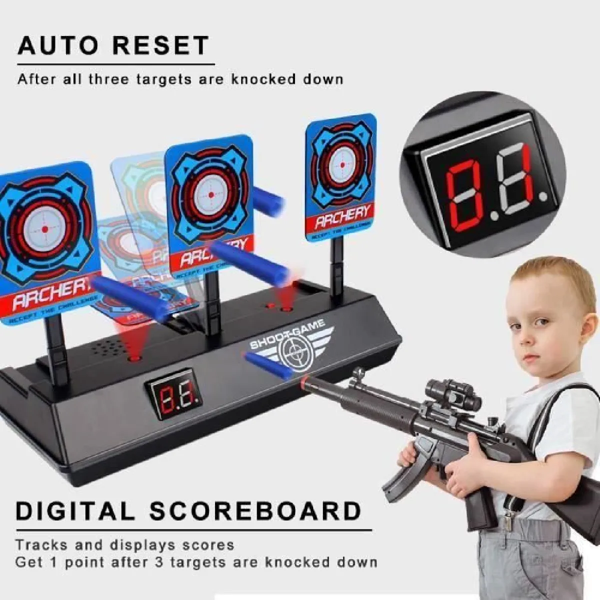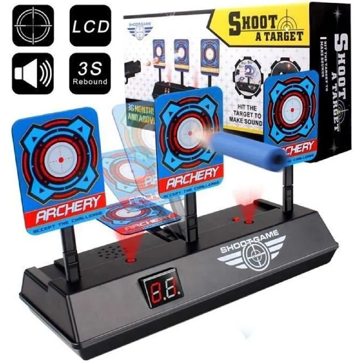 Le système de notation électronique à écran LCD offre un suivi clair jusqu'à 30 points, idéal pour des manches rapides entre amis ou en famille. Les trois cibles se remettent en place grâce à la réinitialisation automatique après 3 secondes, évitant les interruptions et maintenant le rythme du jeu. Les effets de son et lumière intégrés ajoutent un retour immédiat à chaque tir, rendant chaque session plus vivante sans réglages complexes. Conçu en plastique écologique de couleur bleue, l'ensemble résiste aux usages répétés en intérieur comme en extérieur.